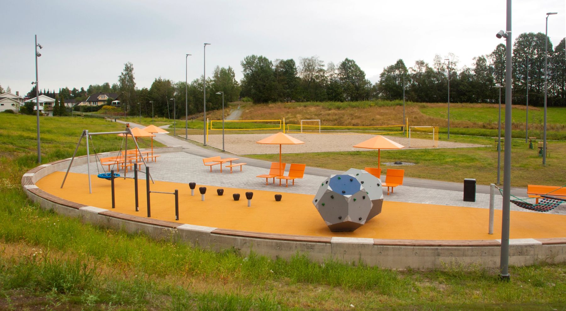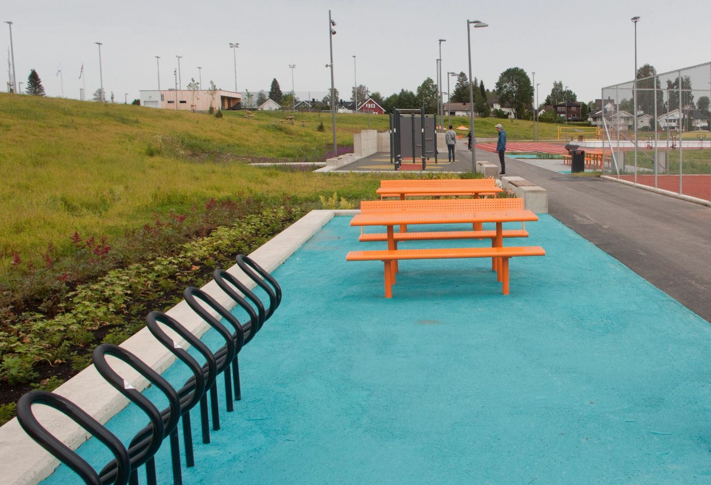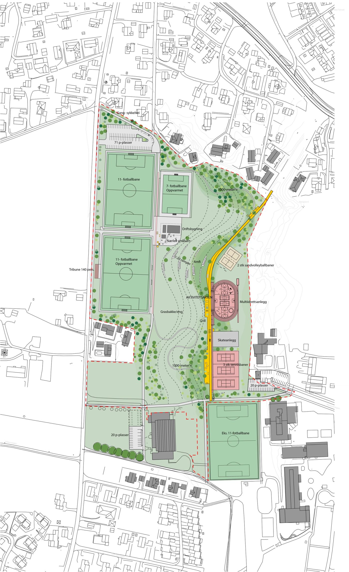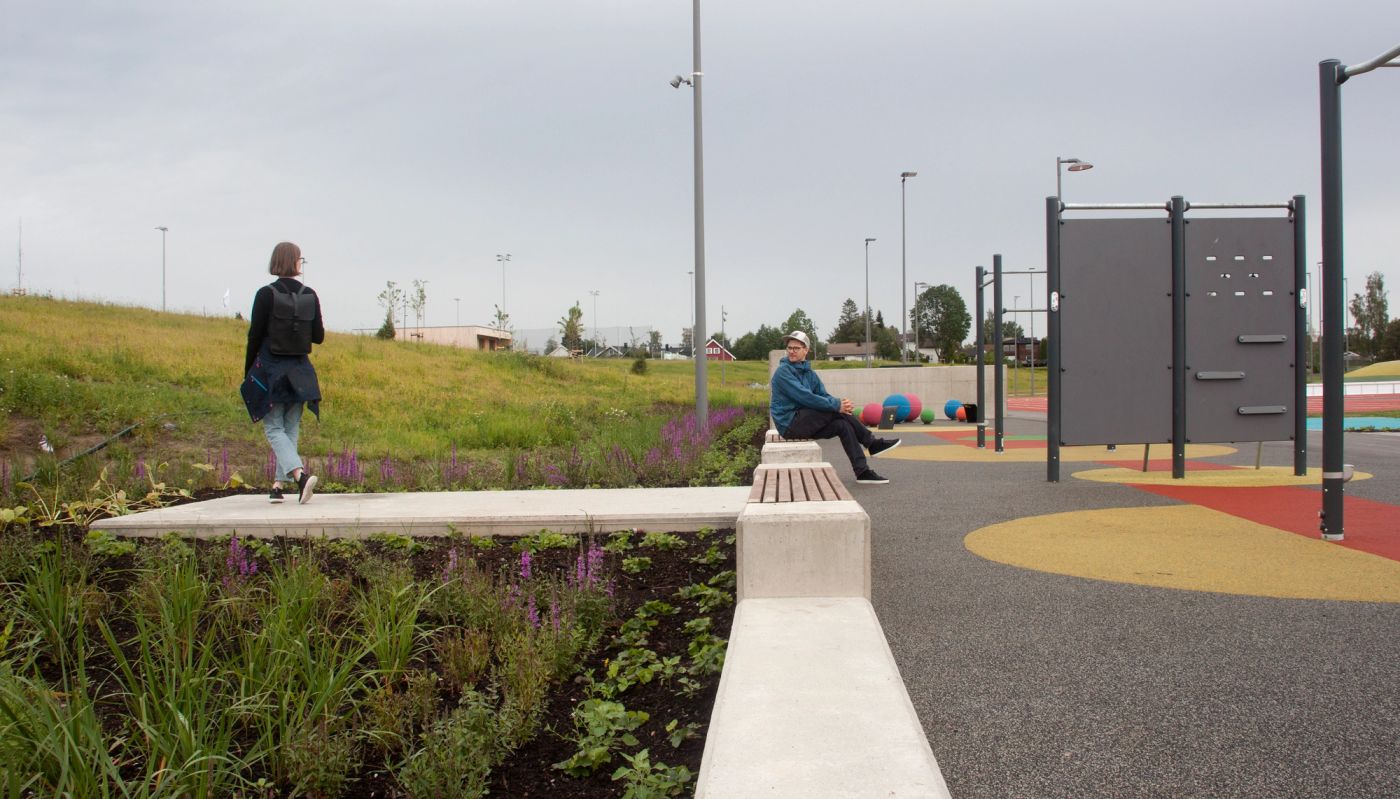 Bakkedalen idrettspark kobler sammen nærliggende skolers og barnehagers uteområde. I bunn av Bakkedalen etableres en tydelig aktivitetsakse som knytter parken sammen fra nord til sør, samtidig som den binder sammen idrettsbaner, møteplasser og uorganisert lek. Aksen varierer i bredde fra 3 meter til 10 meter, fra en enkel gang- sykkelvei til rom for benker, grillplasser, pergolaer, parkour og frodig regnbed. Parken var finalist til årets idrettspark i Park, Bad og Idrett 2021, og vant hedrende omtale i Ullensaker arkitekturpris 2021.