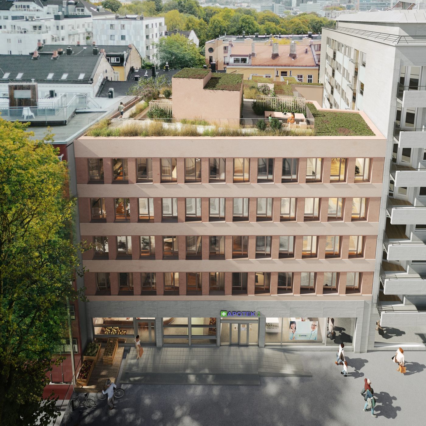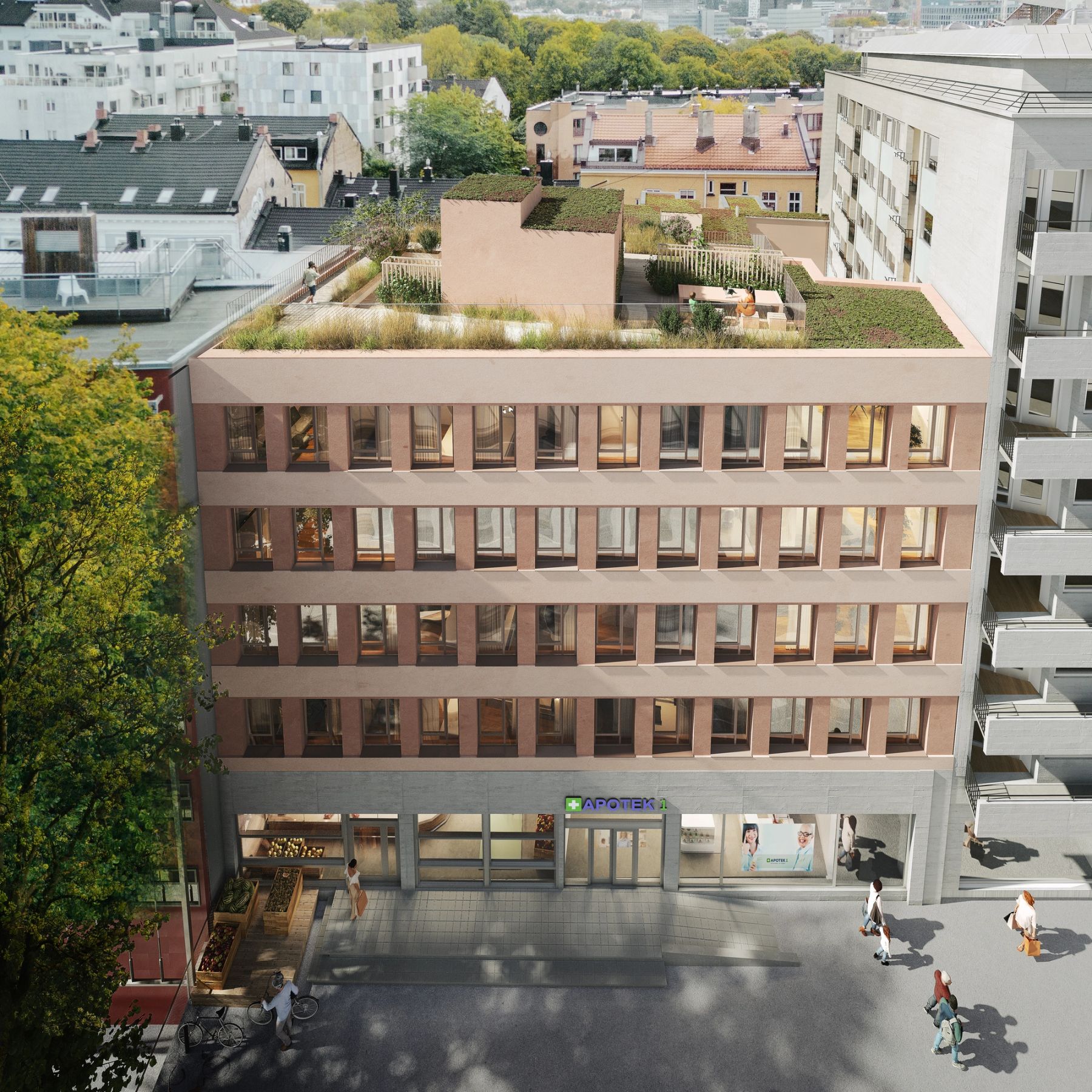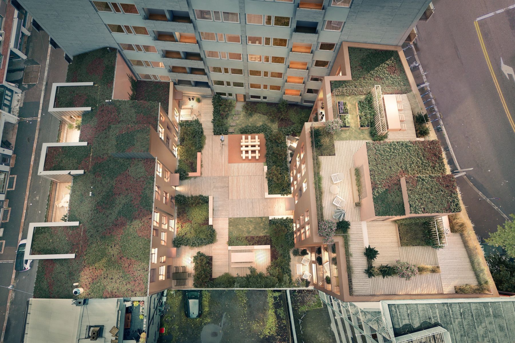 På taket er det etablert en felles terrasse med tredekke, staudebed, busker og sedumflater som ivaretar både rekreasjon og lokal overvannshåndtering. Gårdsrommet mellom byggene gir plass til lek, opphold og biologisk mangfold, et grønt rom midt i den tette byen.
