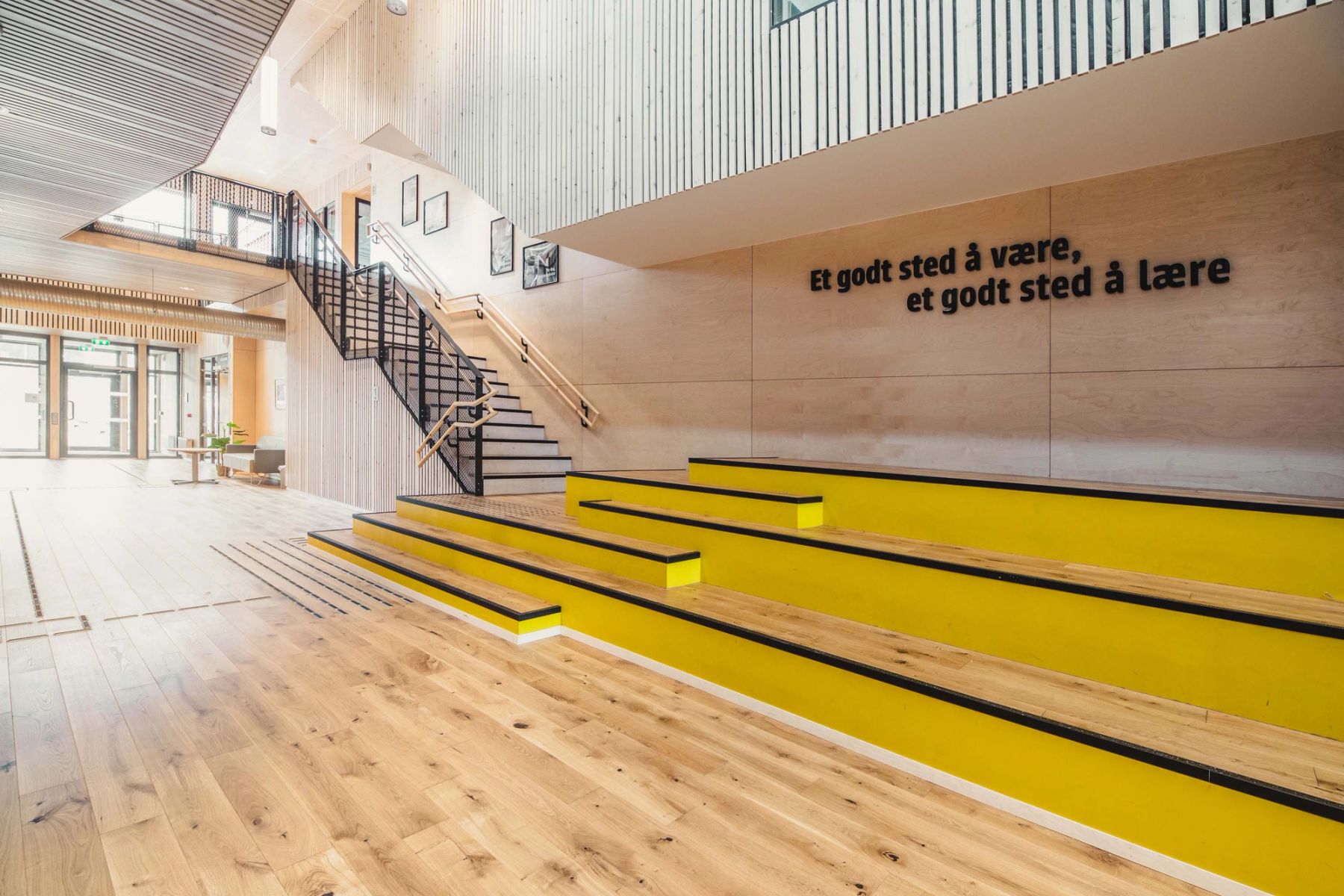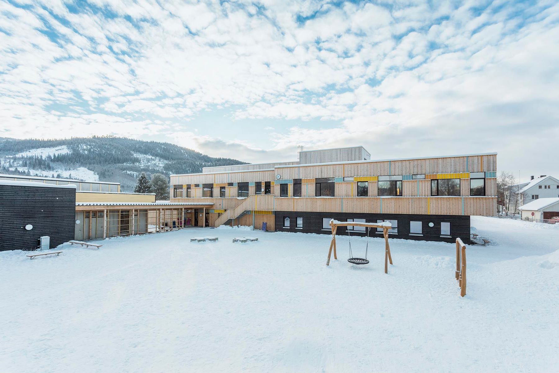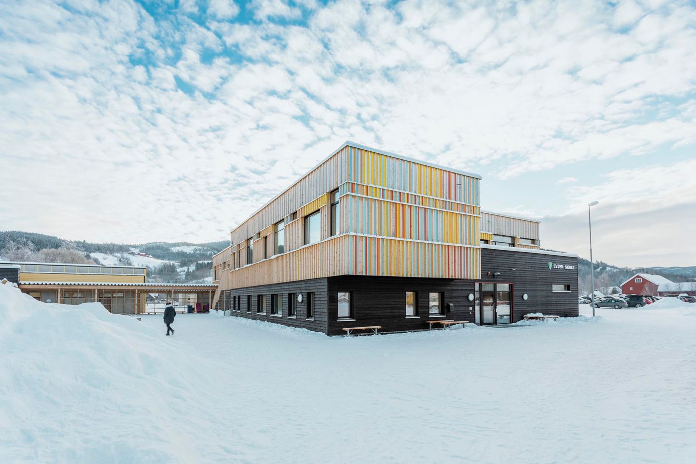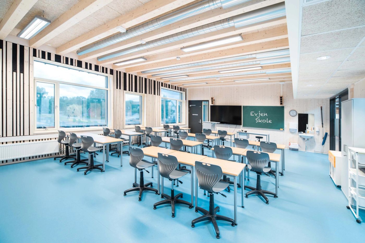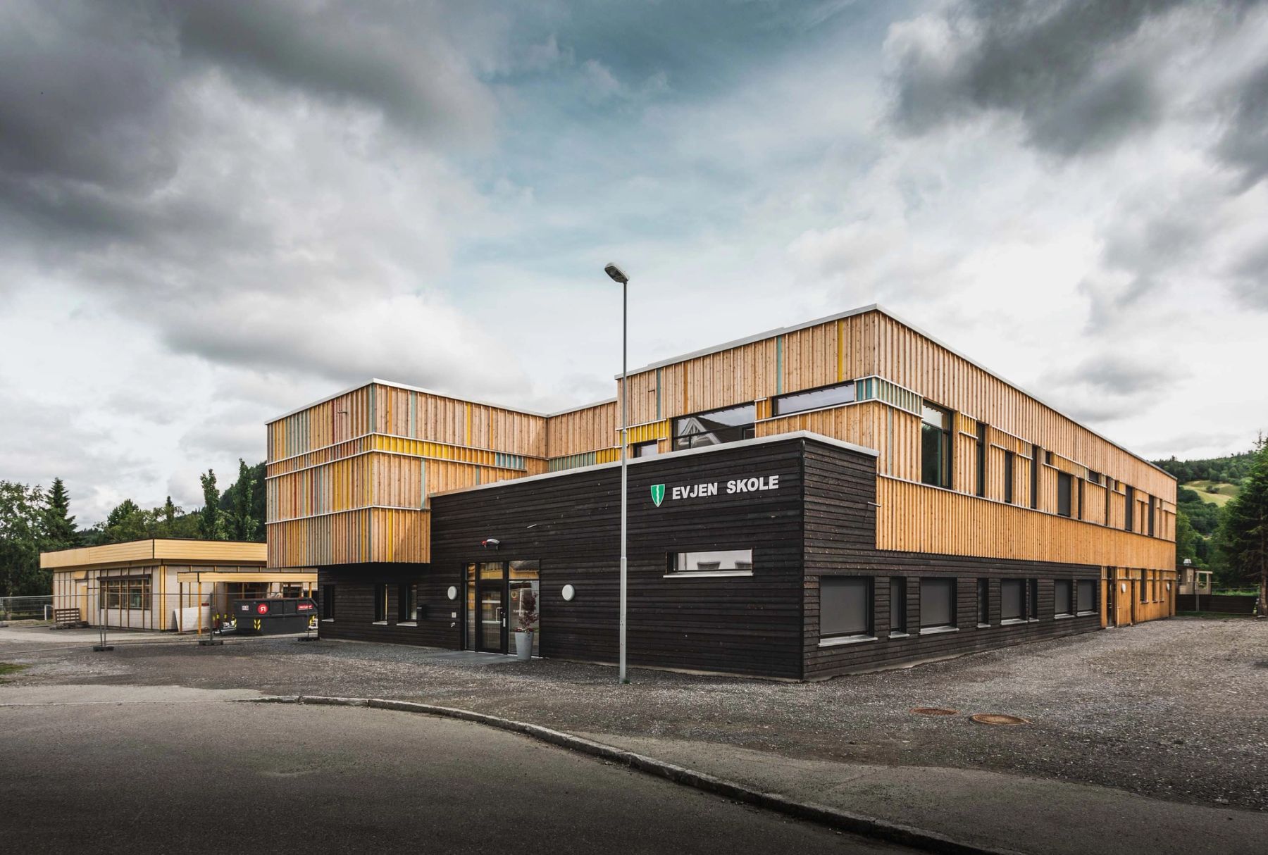 Evjen barneskole er en passivhusskole med bærekonstruksjon i massivtre og limtre. Bygget er preget av en enkel og effektiv planløsning, der alle funksjoner er organisert langs et sentralt atrium. Dagslys har vært et viktig aspekt for design av klasserommene, som får dagslys både fra den ytre fasaden og det indre atriet. Eksponert massivtre, trepanel og kryssfiner er benyttet til innvendige overflater og akustiske krav oppfylles ved å bruke perforert kryssfiner og treullsementplater i taket, samt perforert trepanel på enkelte vegger.