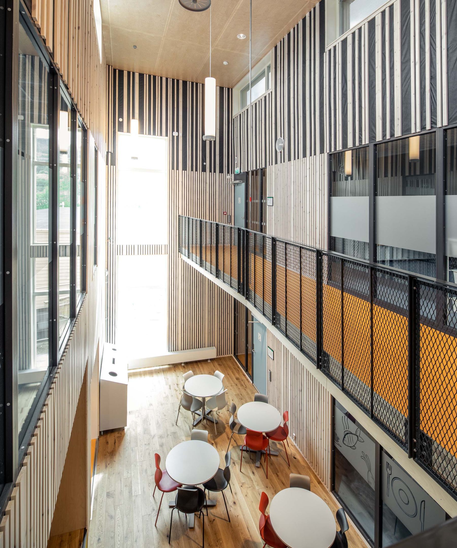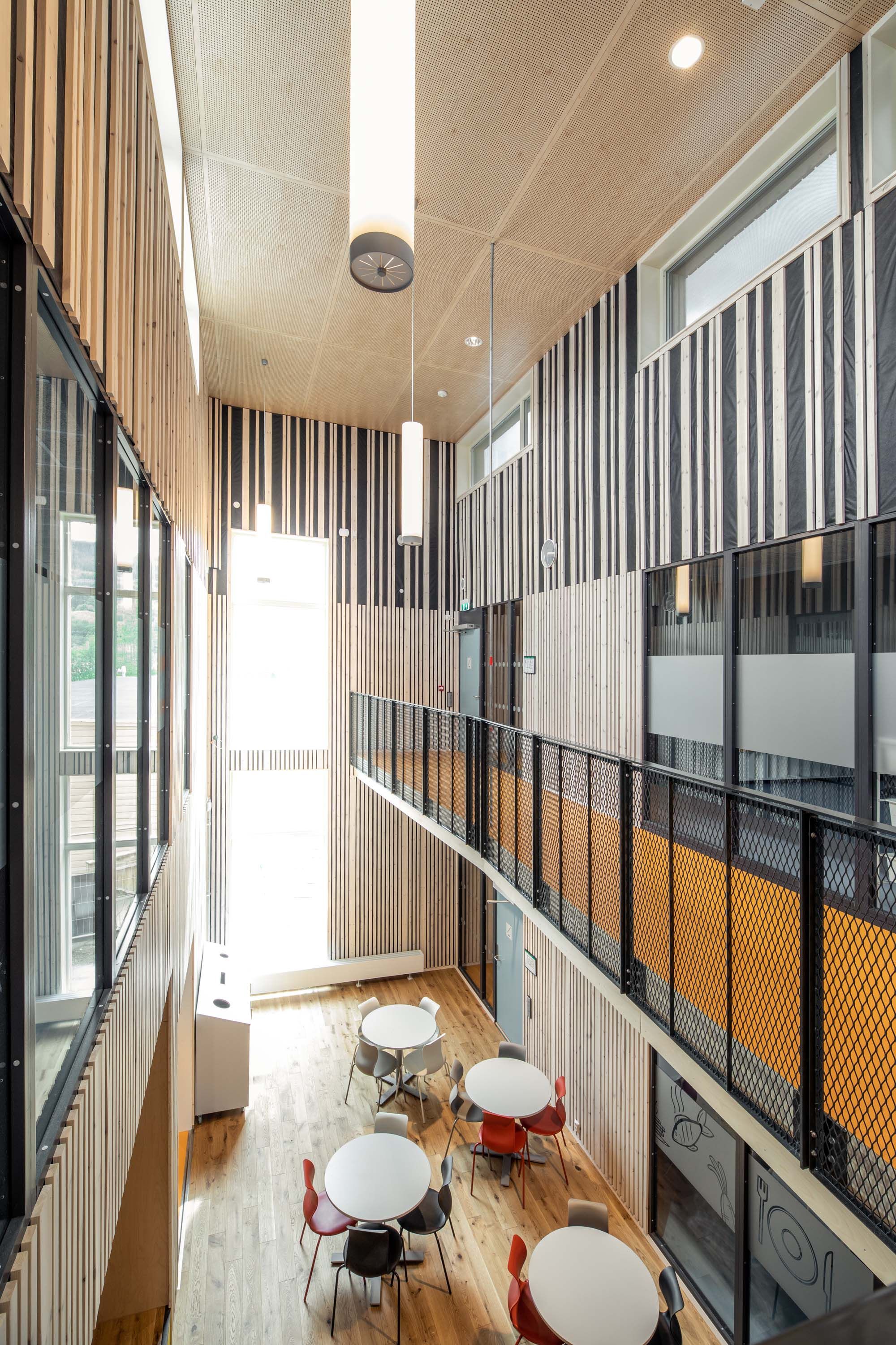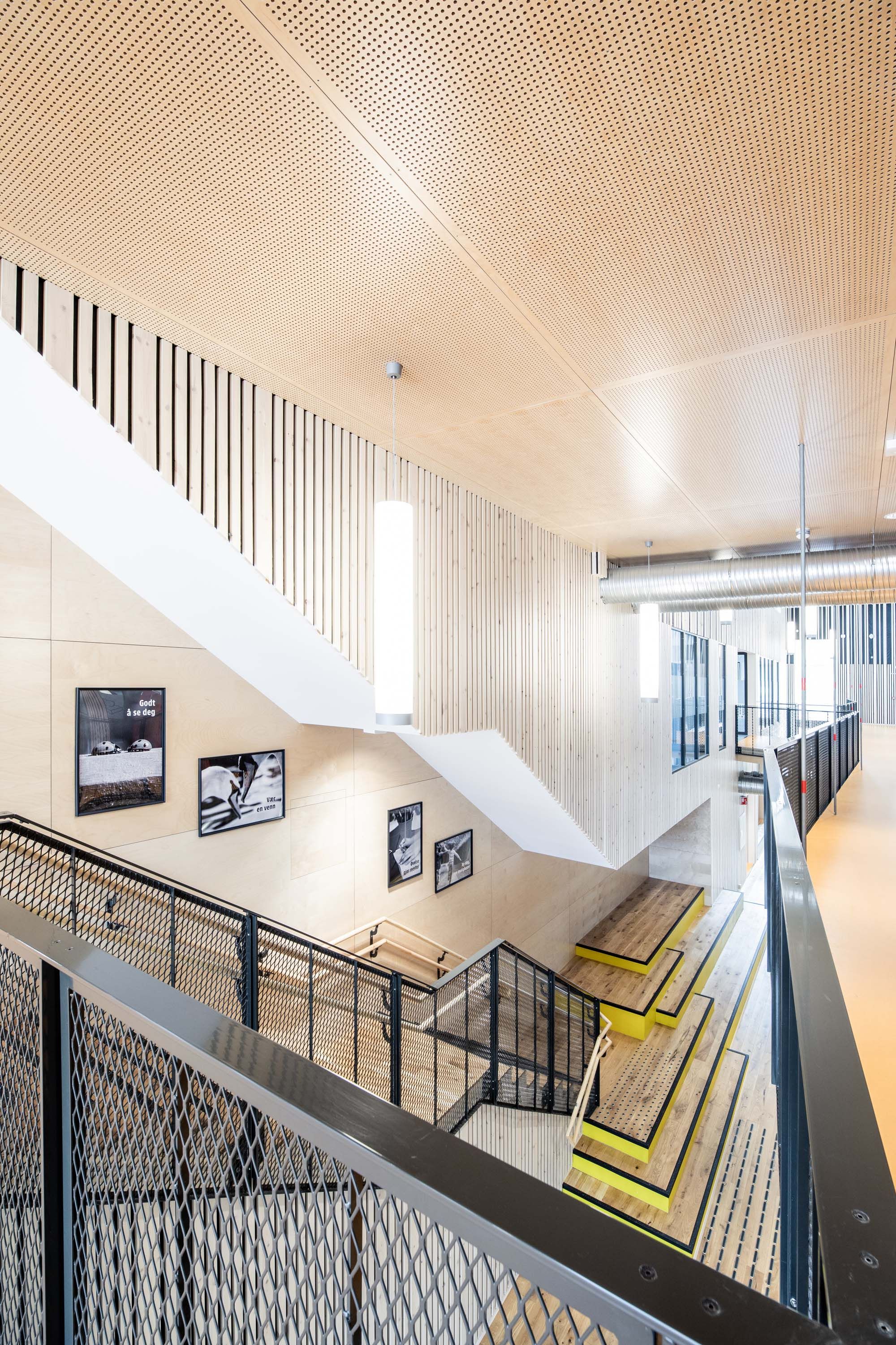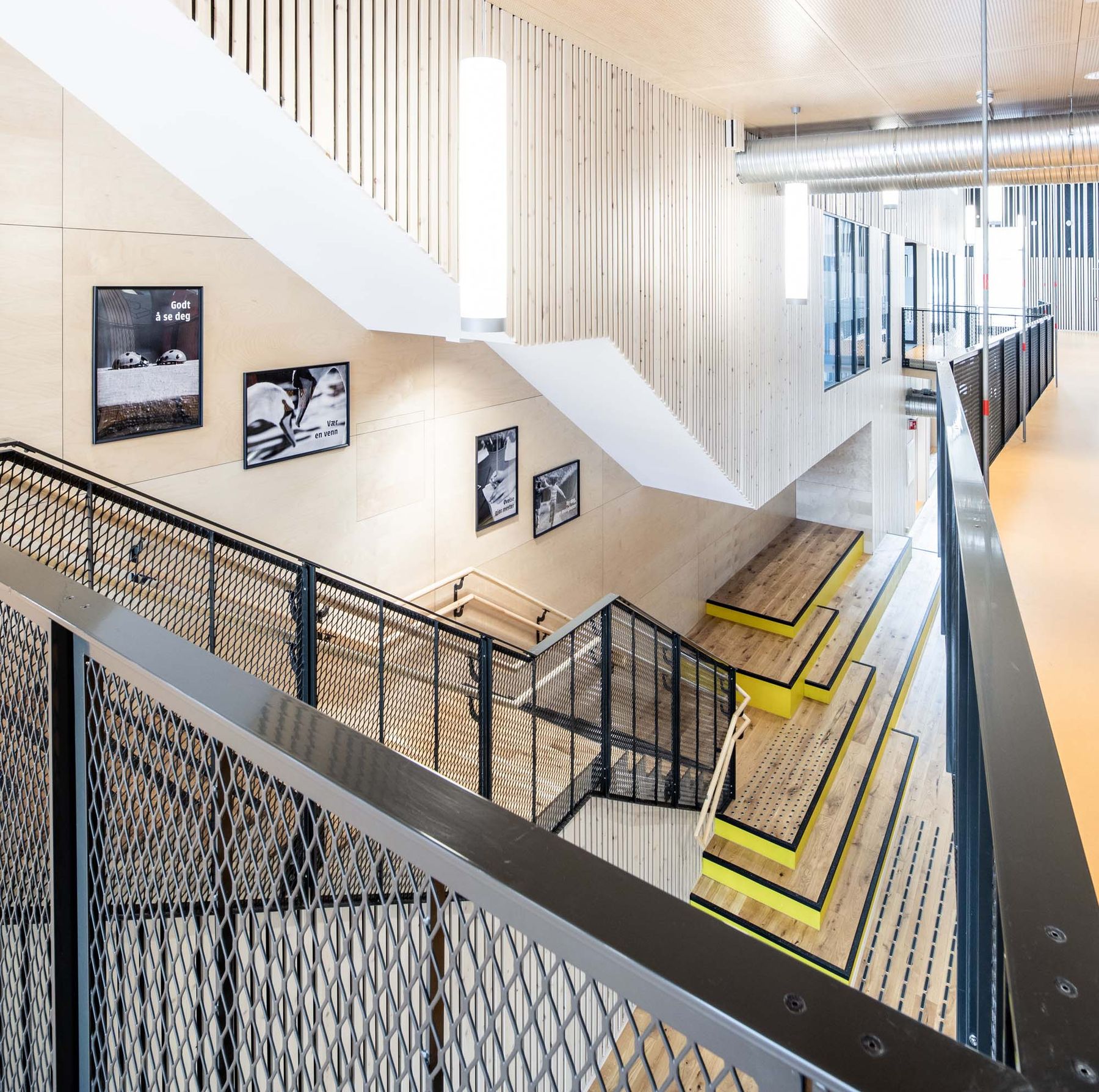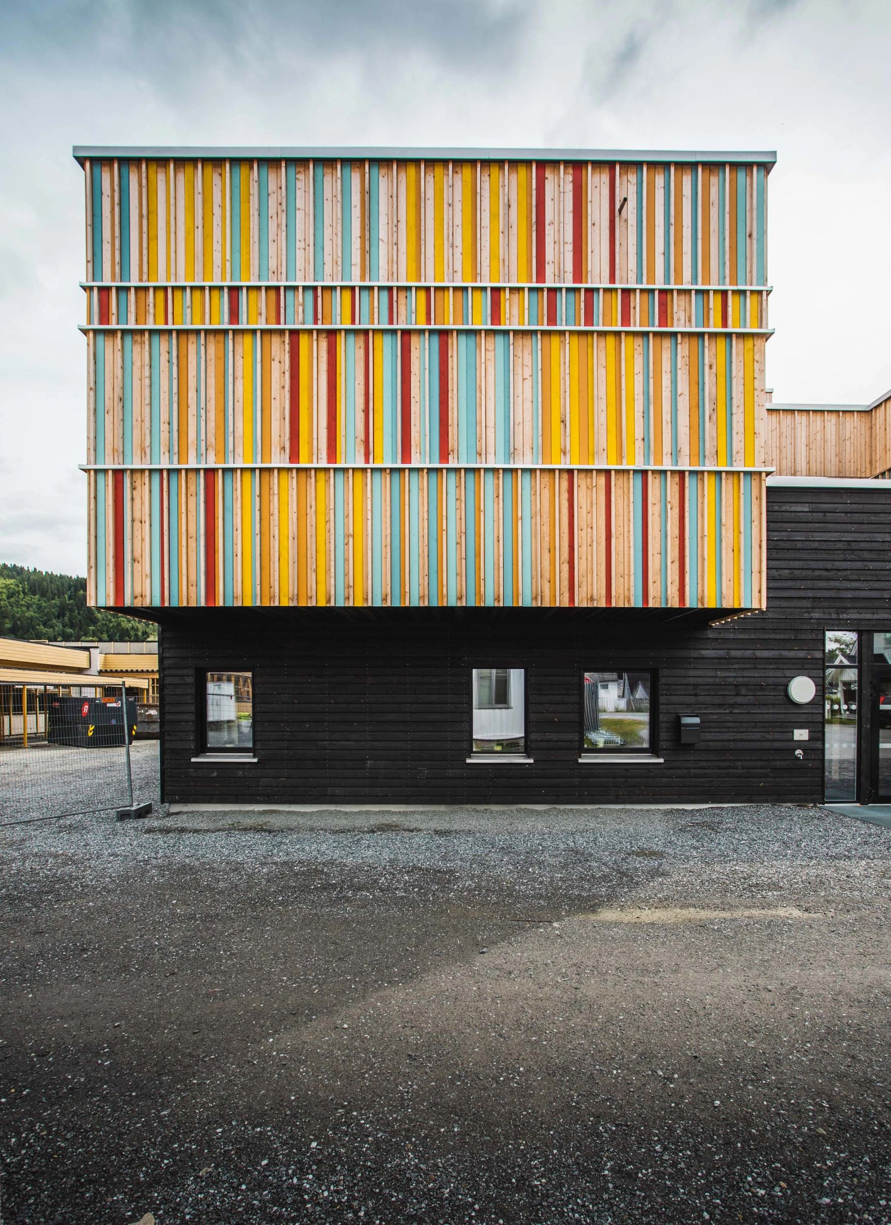 Evjen barneskole er en passivhusskole med bærekonstruksjon i massivtre og limtre. Bygget er preget av en enkel og effektiv planløsning, der alle funksjoner er organisert langs et sentralt atrium. Dagslys har vært et viktig aspekt for design av klasserommene, som får dagslys både fra den ytre fasaden og det indre atriet. Eksponert massivtre, trepanel og kryssfiner er benyttet til innvendige overflater og akustiske krav oppfylles ved å bruke perforert kryssfiner og treullsementplater i taket, samt perforert trepanel på enkelte vegger.