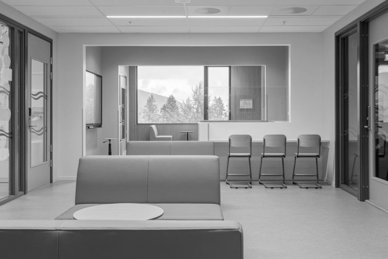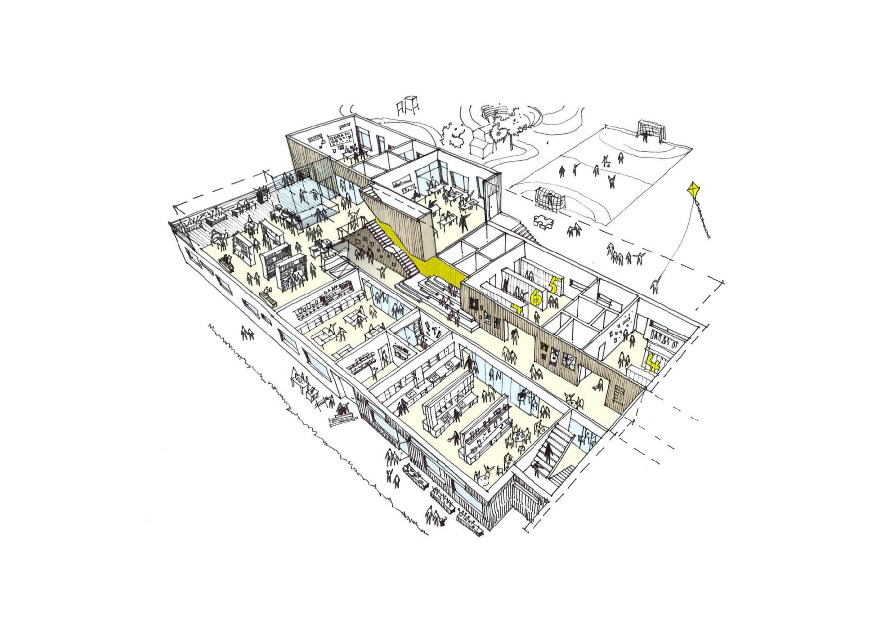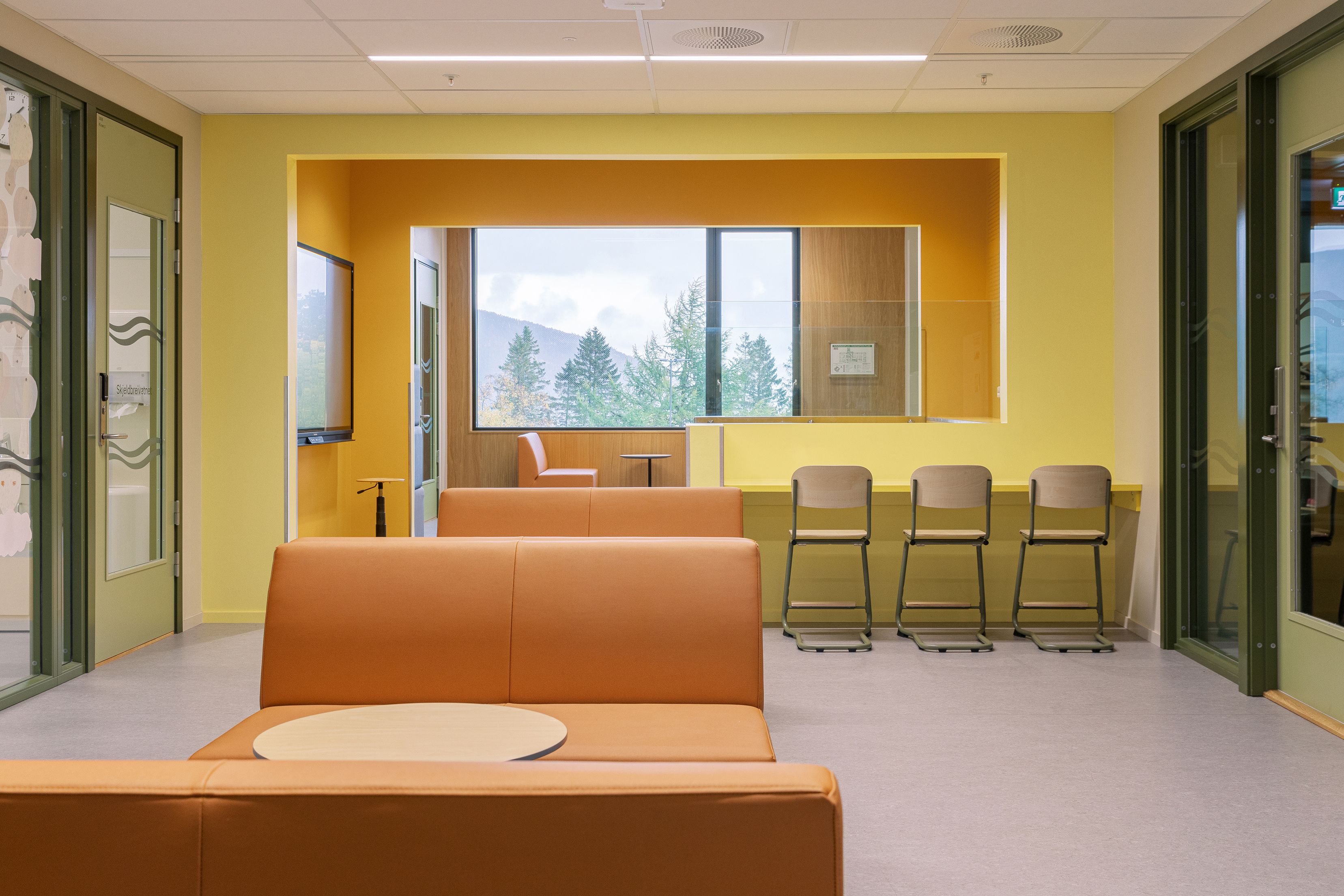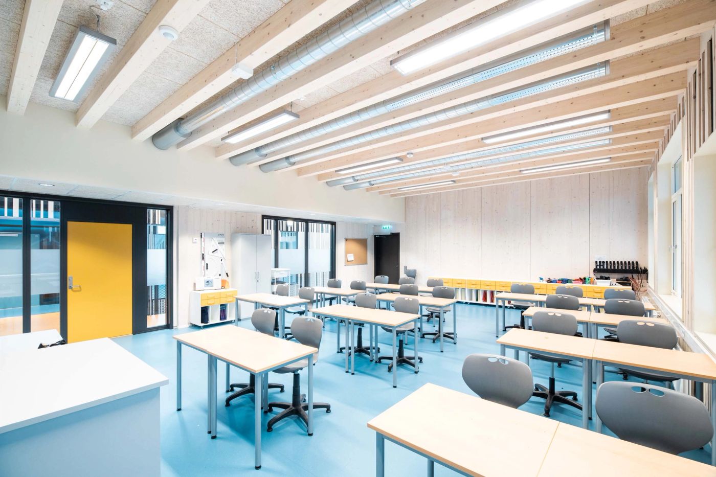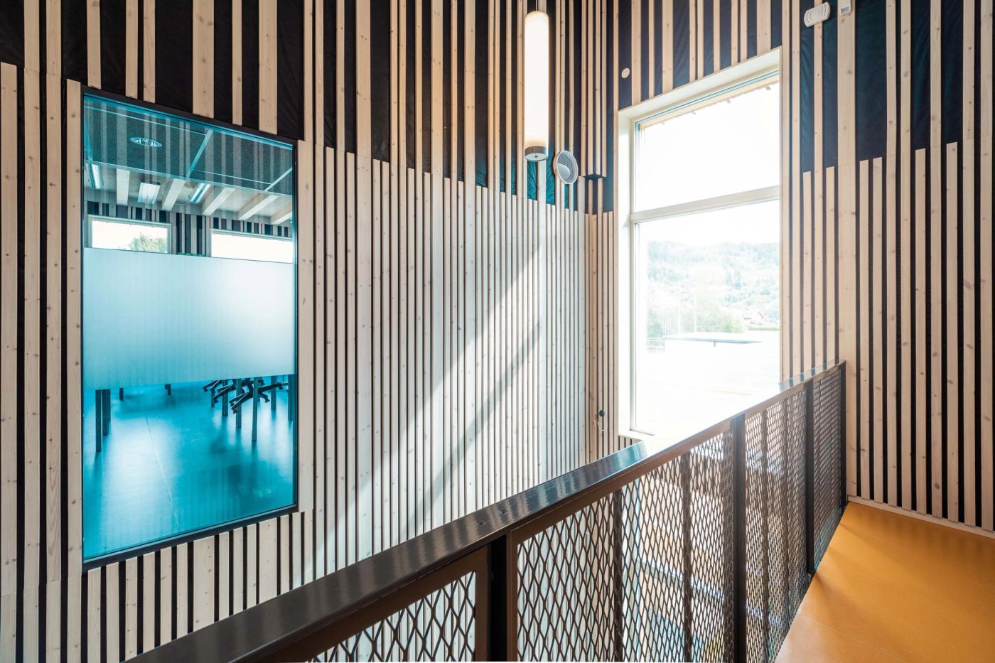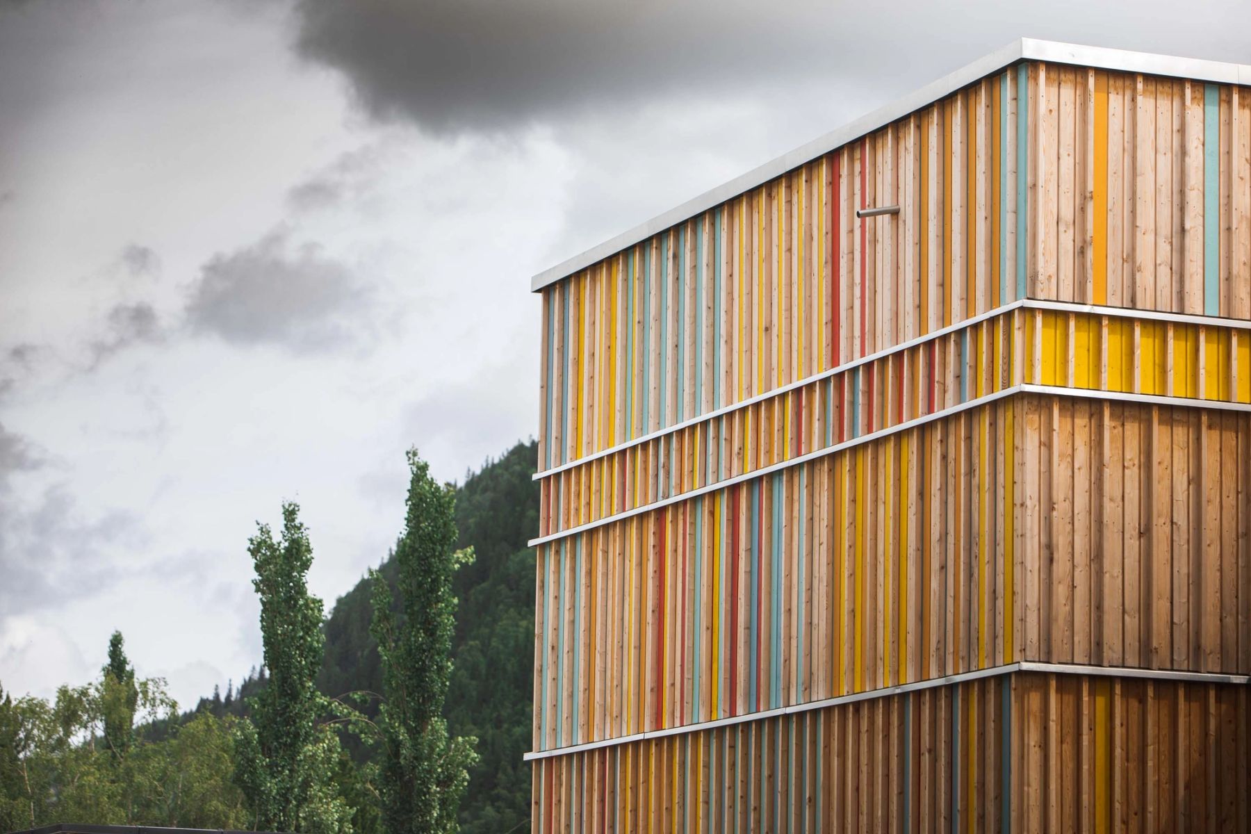 Evjen barneskole er en passivhusskole med bærekonstruksjon i massivtre og limtre. Bygget er preget av en enkel og effektiv planløsning, der alle funksjoner er organisert langs et sentralt atrium. Dagslys har vært et viktig aspekt for design av klasserommene, som får dagslys både fra den ytre fasaden og det indre atriet. Eksponert massivtre, trepanel og kryssfiner er benyttet til innvendige overflater og akustiske krav oppfylles ved å bruke perforert kryssfiner og treullsementplater i taket, samt perforert trepanel på enkelte vegger.