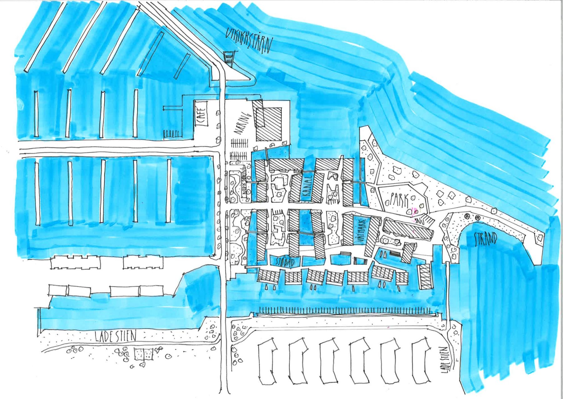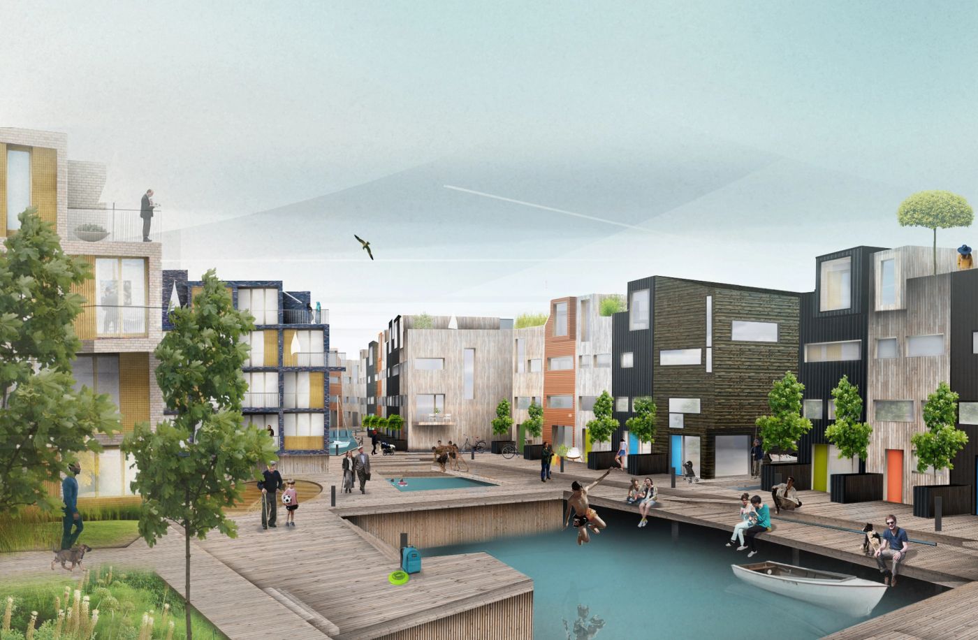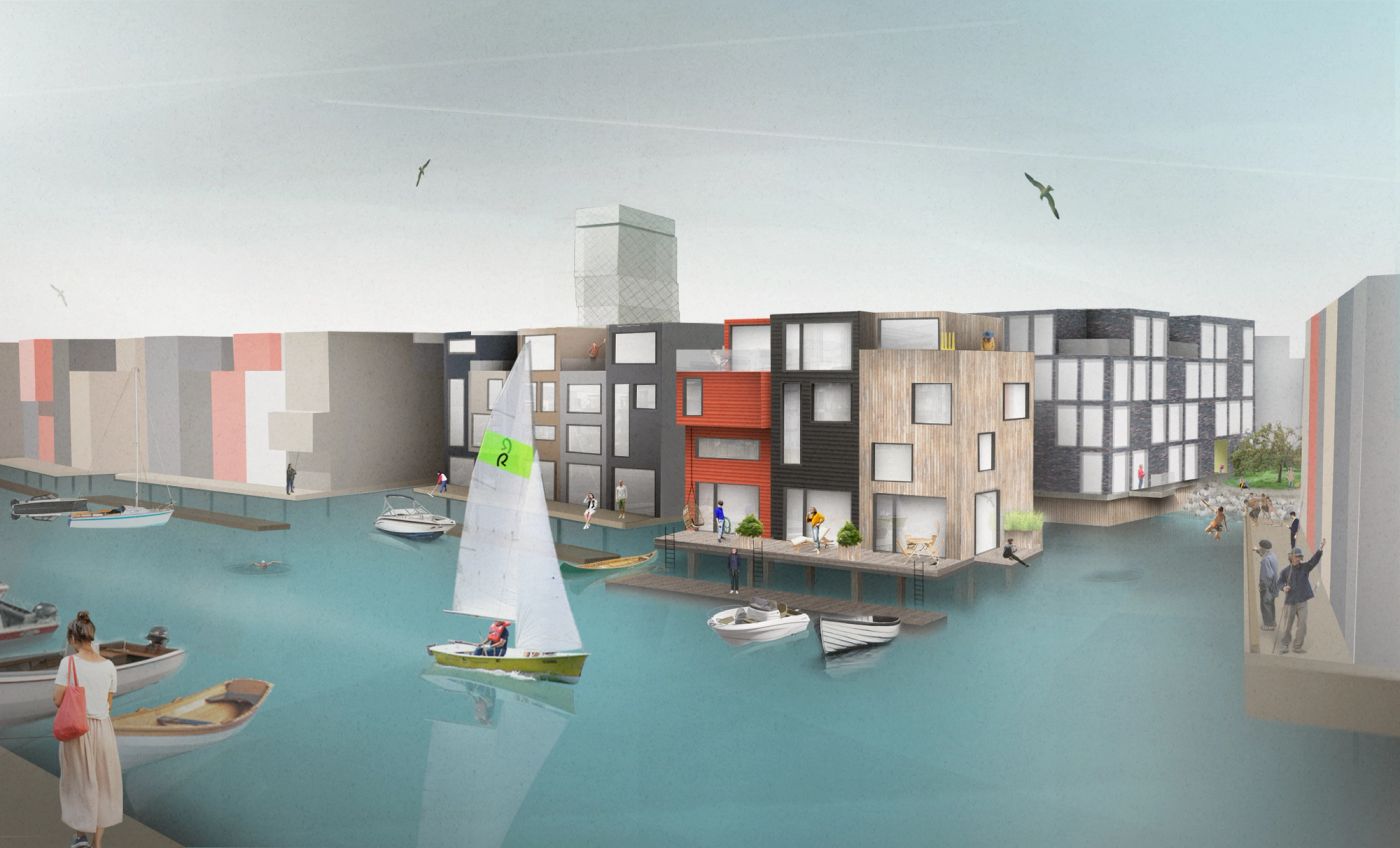 PIR2s forslag var en kanalby, med kvartalhusbebyggelse satt sammen av kanalhus. Tomta har en spektakulær beliggenhet med sjø på alle sider, og forslaget skulle utnytte dette ved å slippe sjøvann inn i kanaler mellom husrekker, bygge brygger og hus på peler i indre kanal, samt etablere hager med vannspeil og planter i vann. Disse grepene resulterer i boliger «på vannet», hvor alle leiligheter har vann på minst en side.