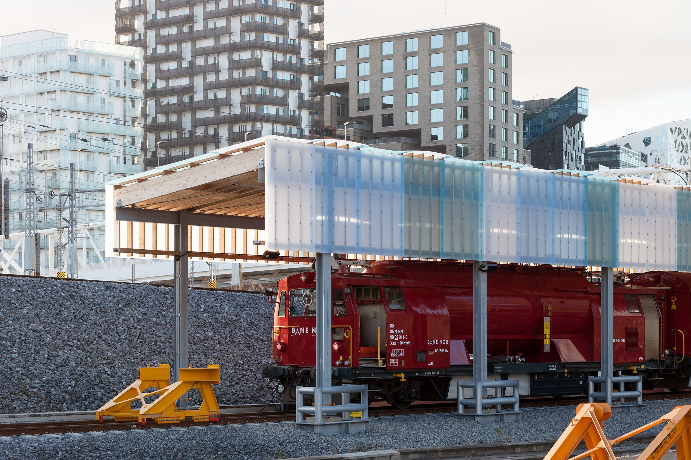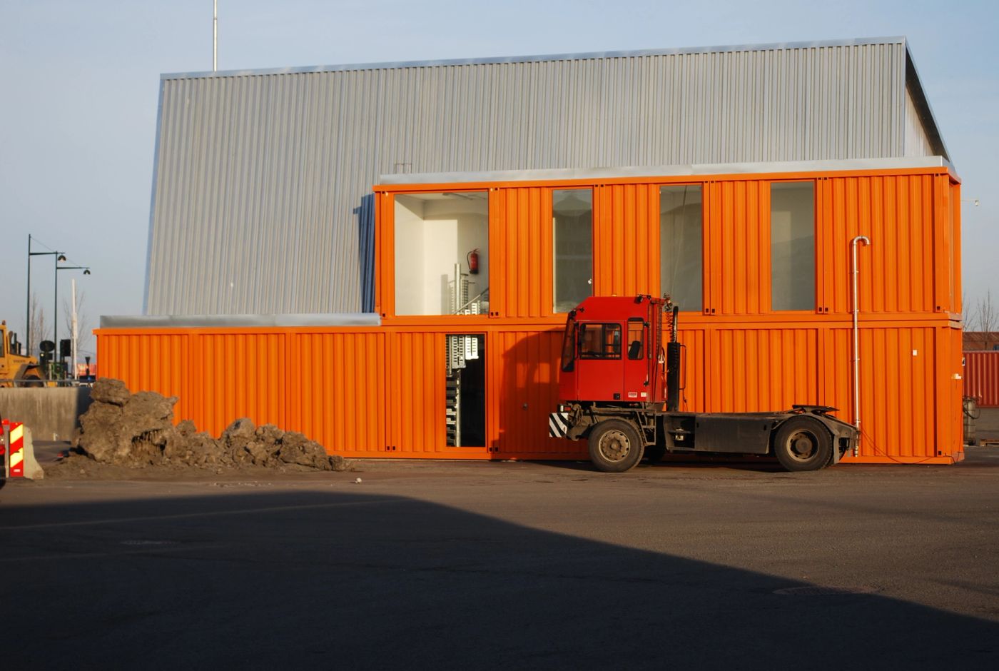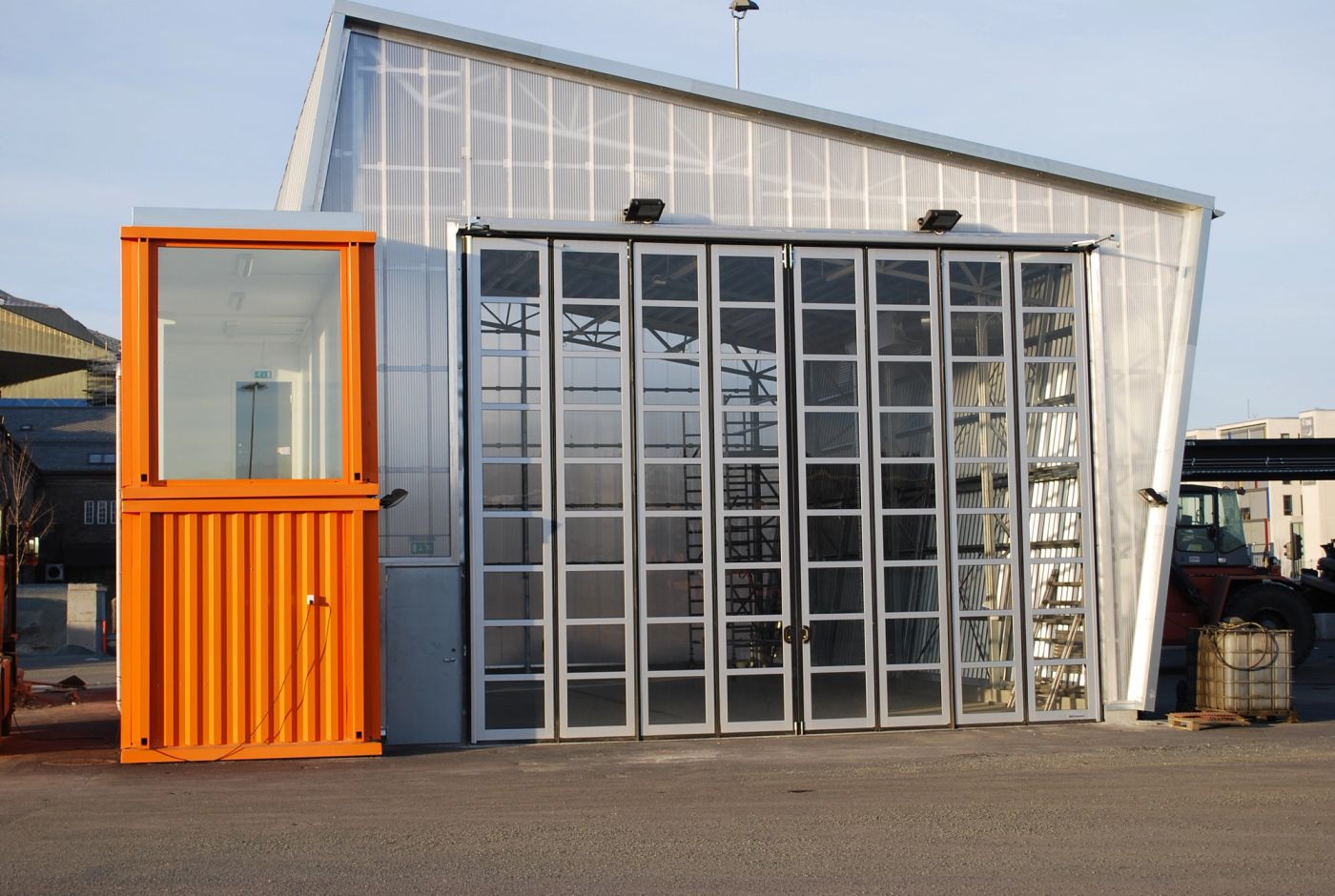 Truckgarasjen består av en kombinasjon av containermoduler og en hallkonstruksjon. De to nybyggene har en sammenheng i materialbruk og uttrykk. Garasjens lagersone og isolerte rom er bygd opp med containermoduler med samme detaljering som ekspedisjonsbygget. Disse funksjonene er lagt på vestsiden mot ekspedisjonsbygget slik at sammenhengen mellom byggene blir tydelig.