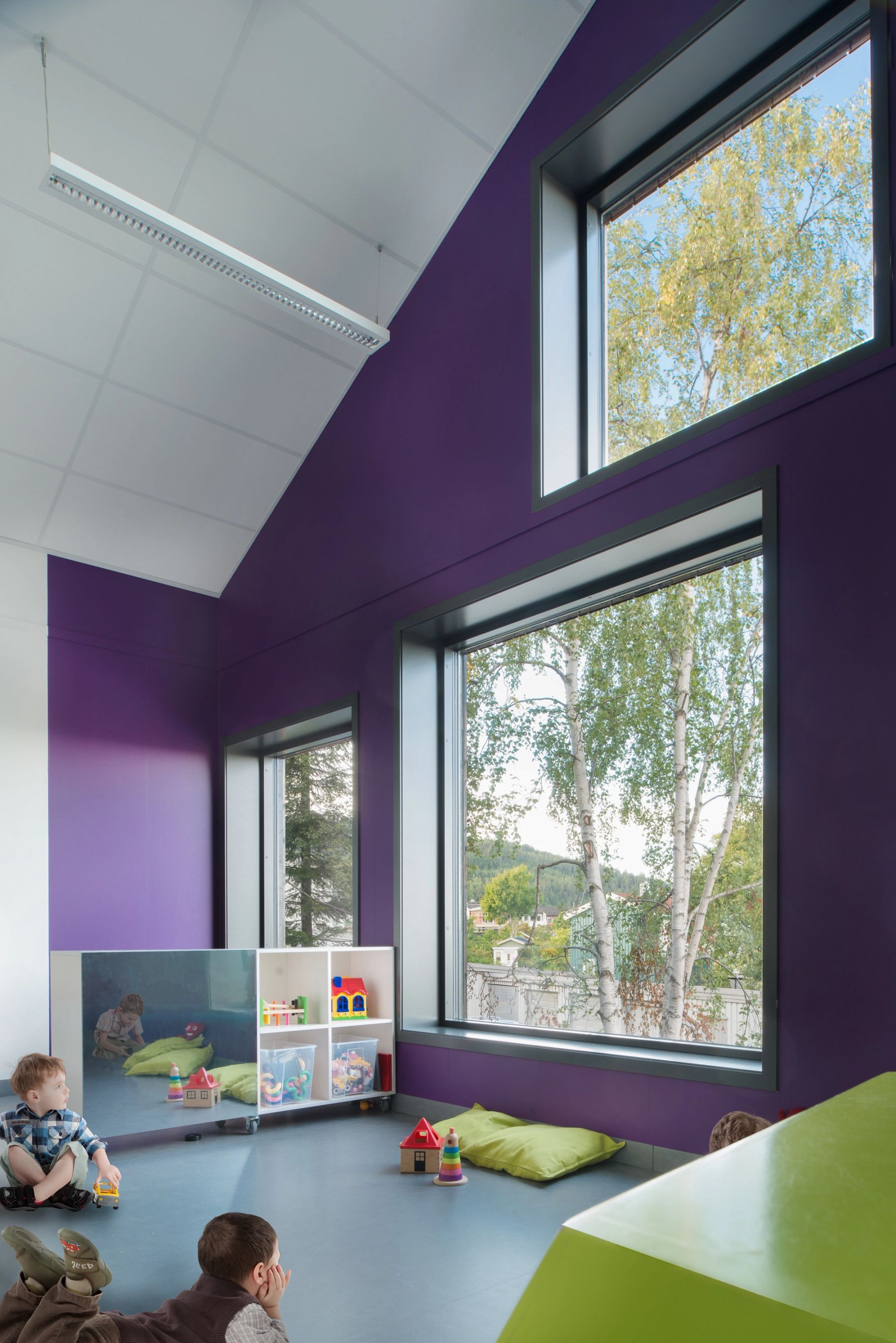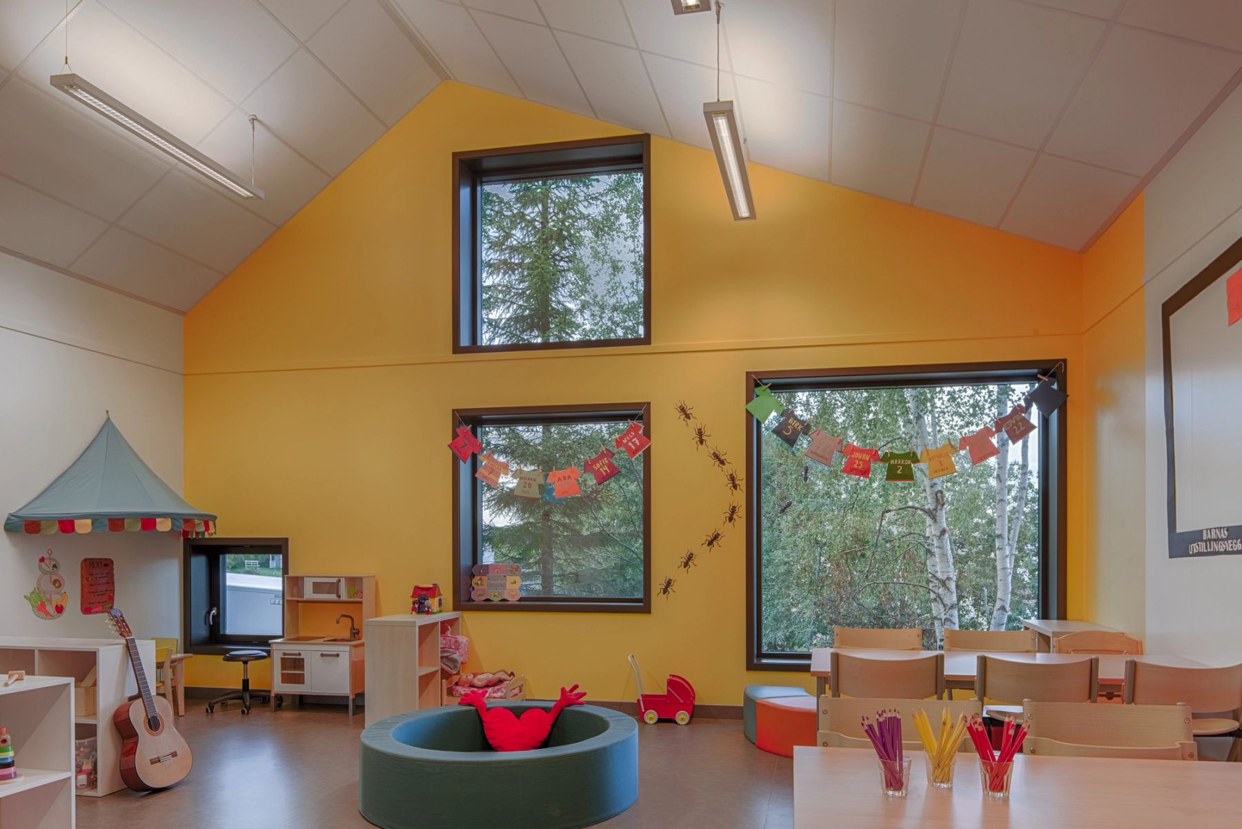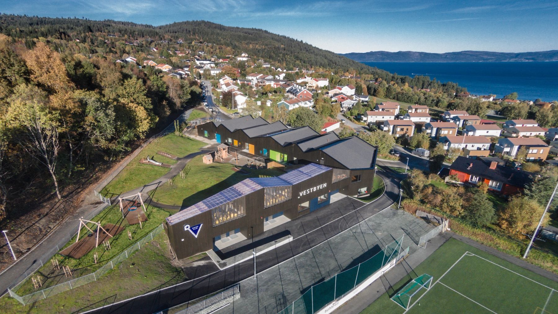 Barnehage for fem avdelinger (inntil 100 barn) ved Markagrensen i Trondheim og ny idrettsgarderobe og klubbhus for Vestbyen IL. Felles utbygging etter riving av tidligere klubbhus. Barnehagens plassering utnytter tomtens ressurser maksimalt med hensyn til areal og solforhold.