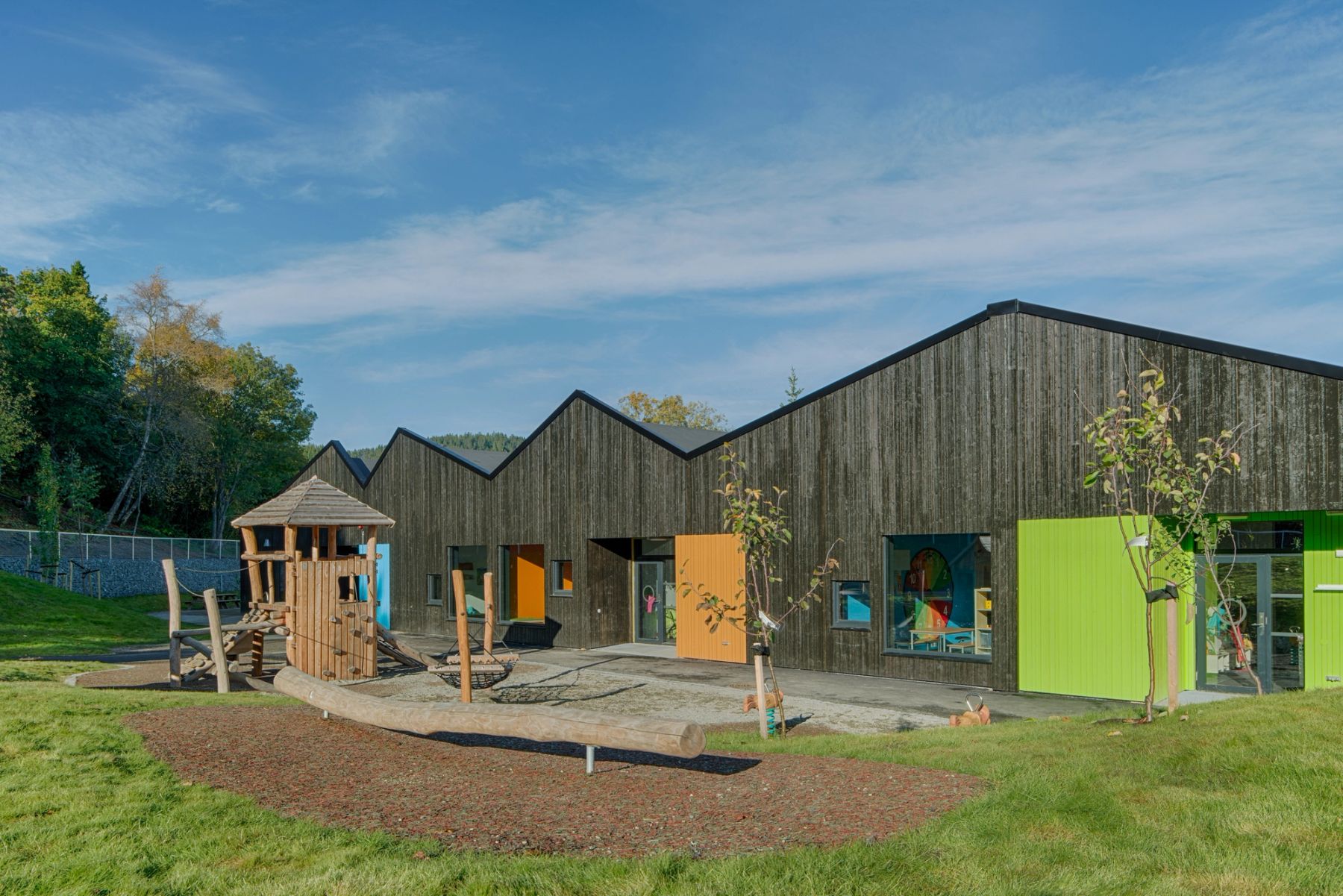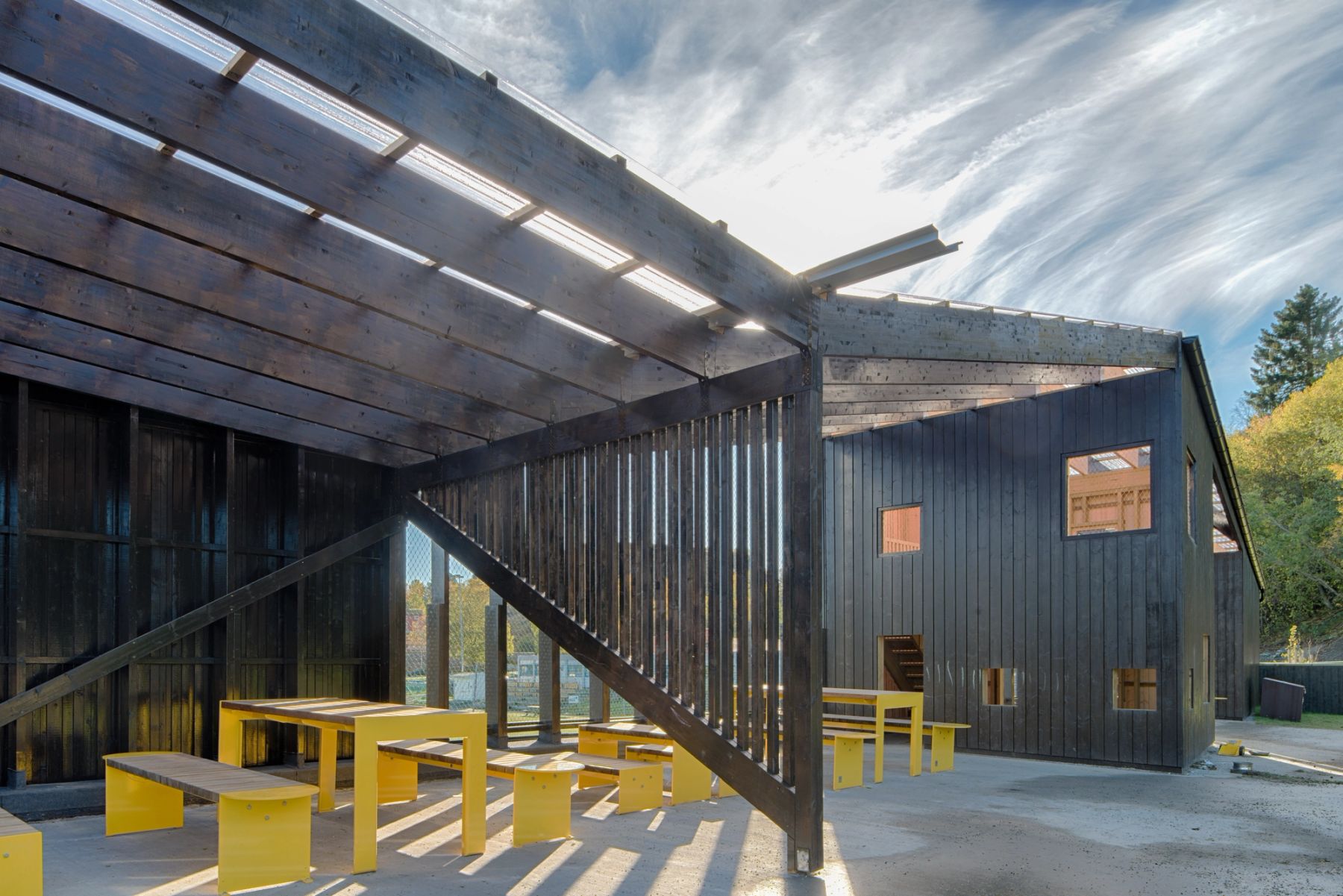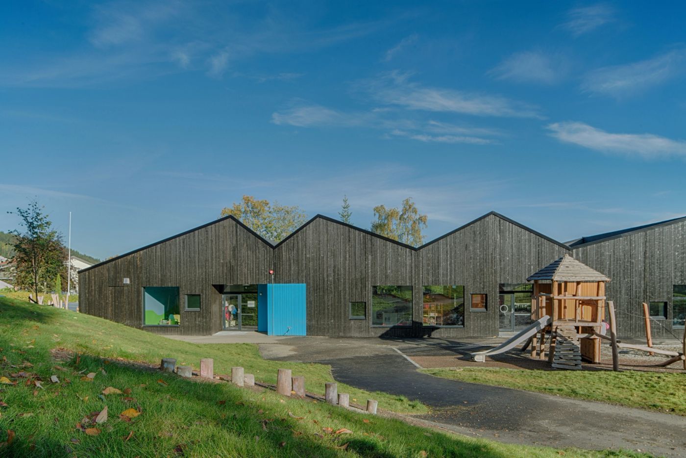 Utformingen er basert på skråtak og uregelmessige åpninger. Hovedmaterialer i konstruksjon og kledning er er tre og trebaserte materialer. Deler av utearealet er overdekt med transparente plater og fasaden har fargesatte kontrastelementer.
