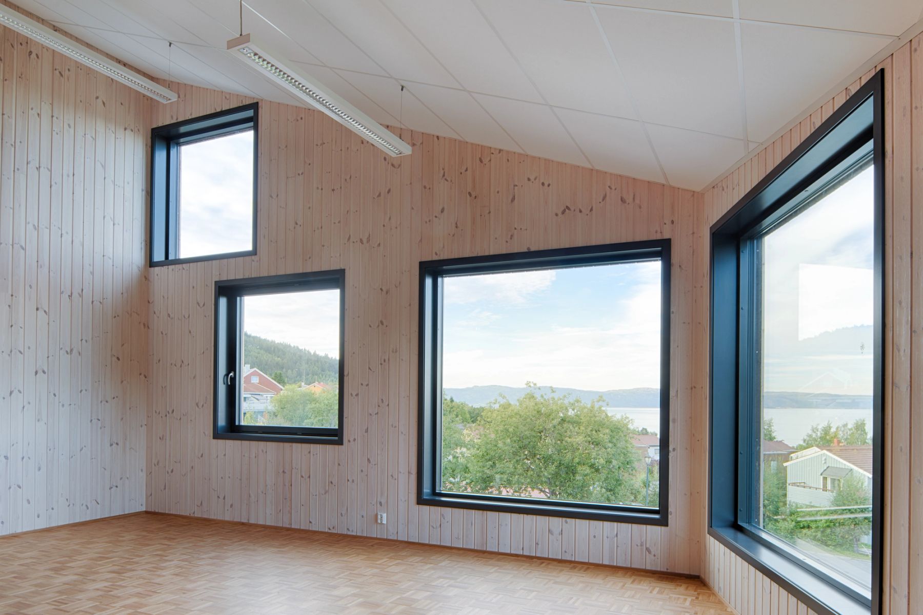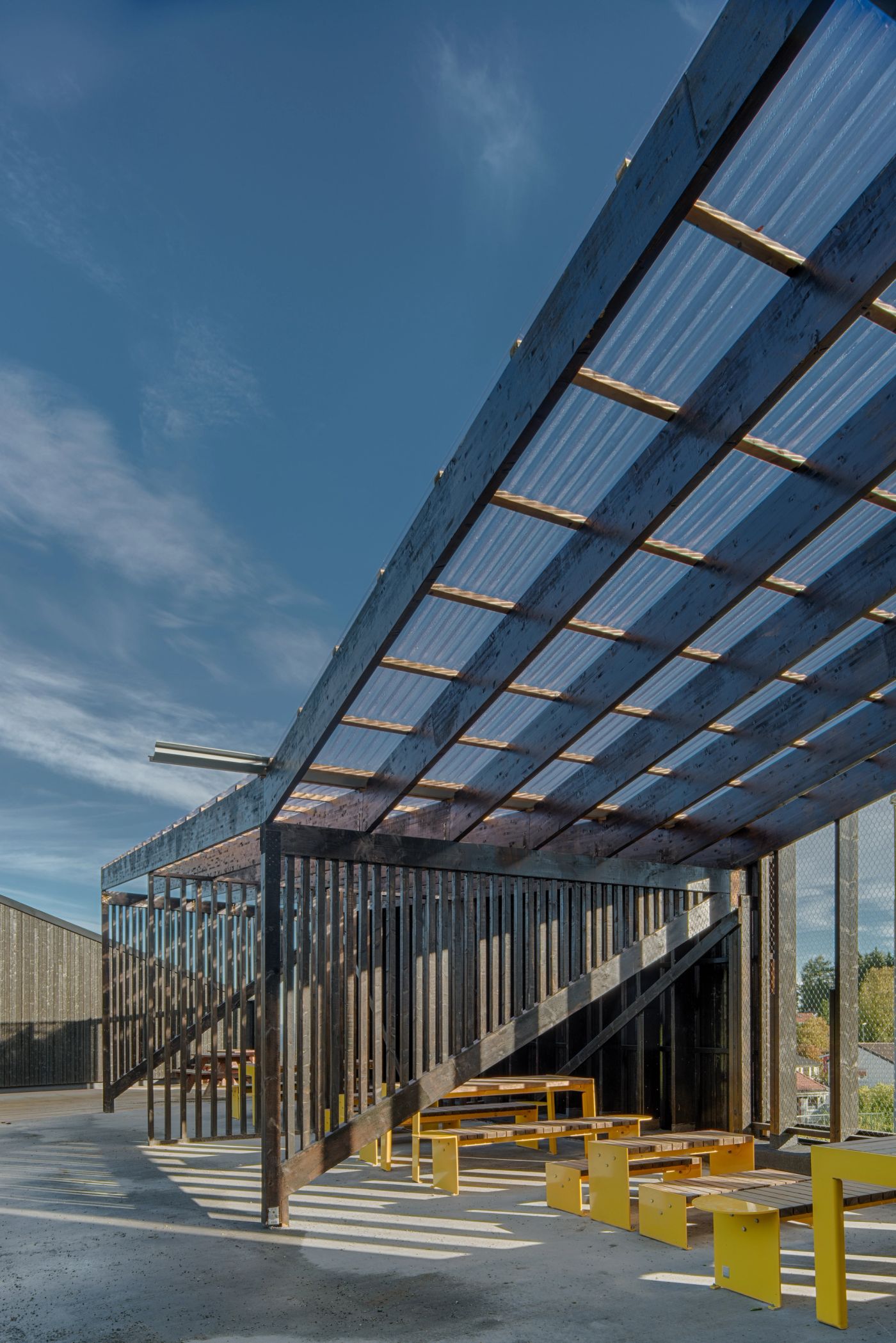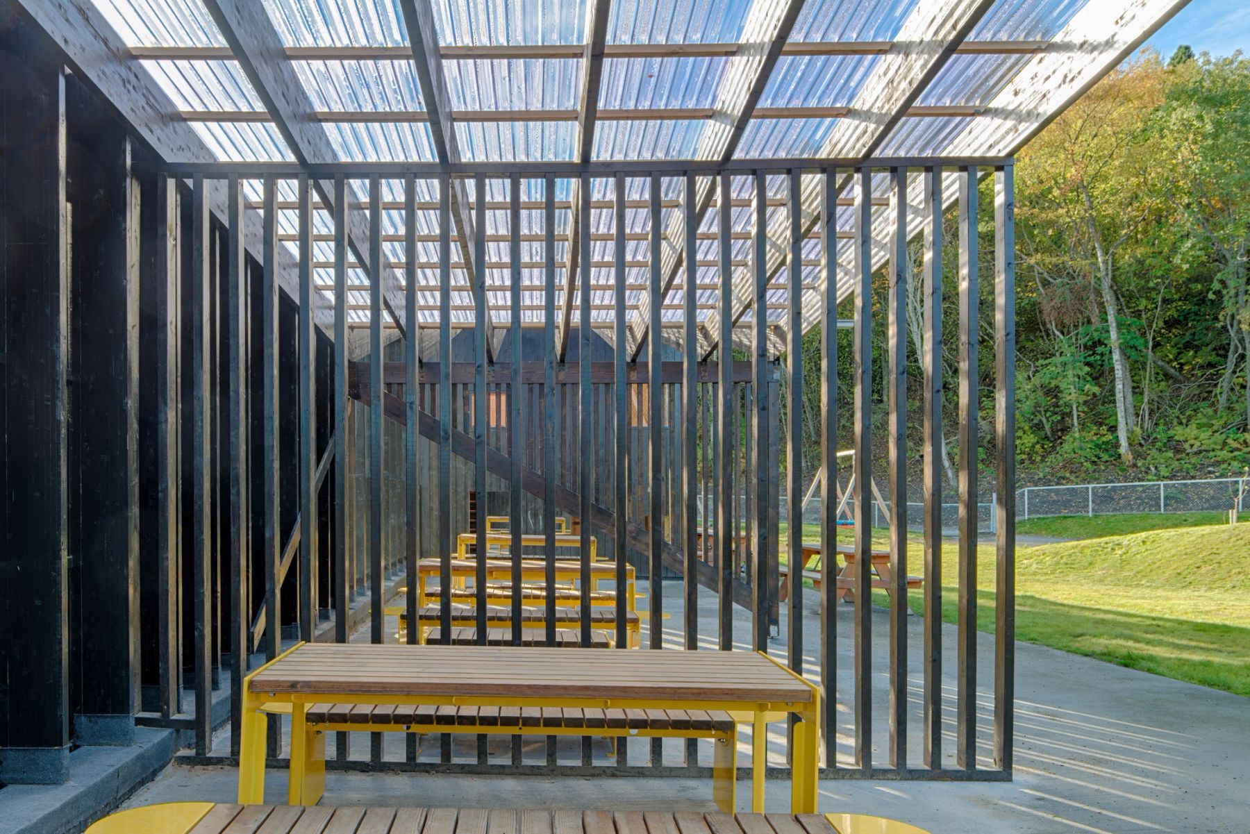 Utformingen er basert på skråtak og uregelmessige åpninger. Hovedmaterialer i konstruksjon og kledning er er tre og trebaserte materialer. Deler av utearealet er overdekt med transparente plater og fasaden har fargesatte kontrastelementer.