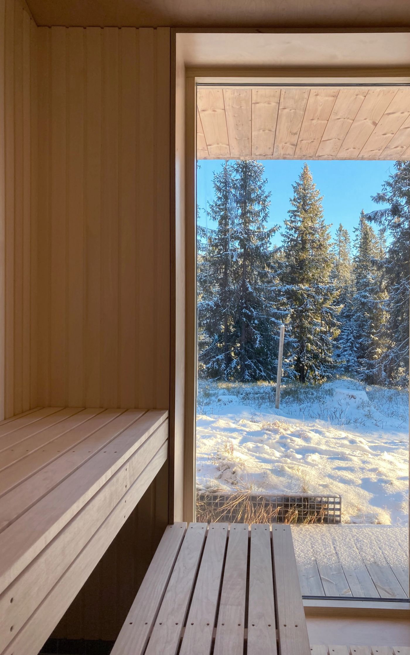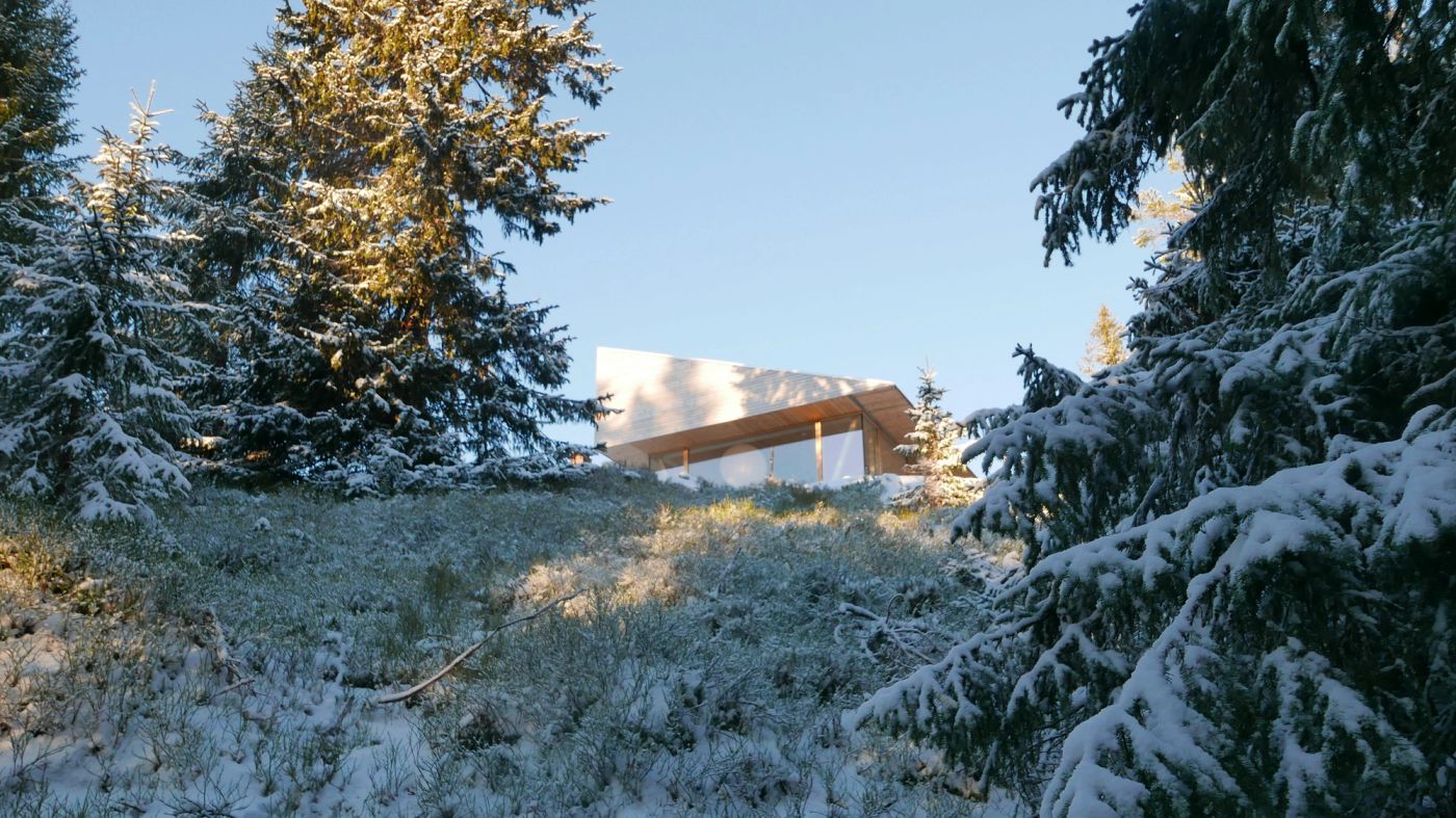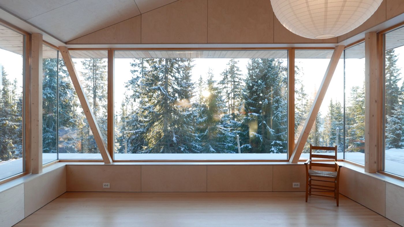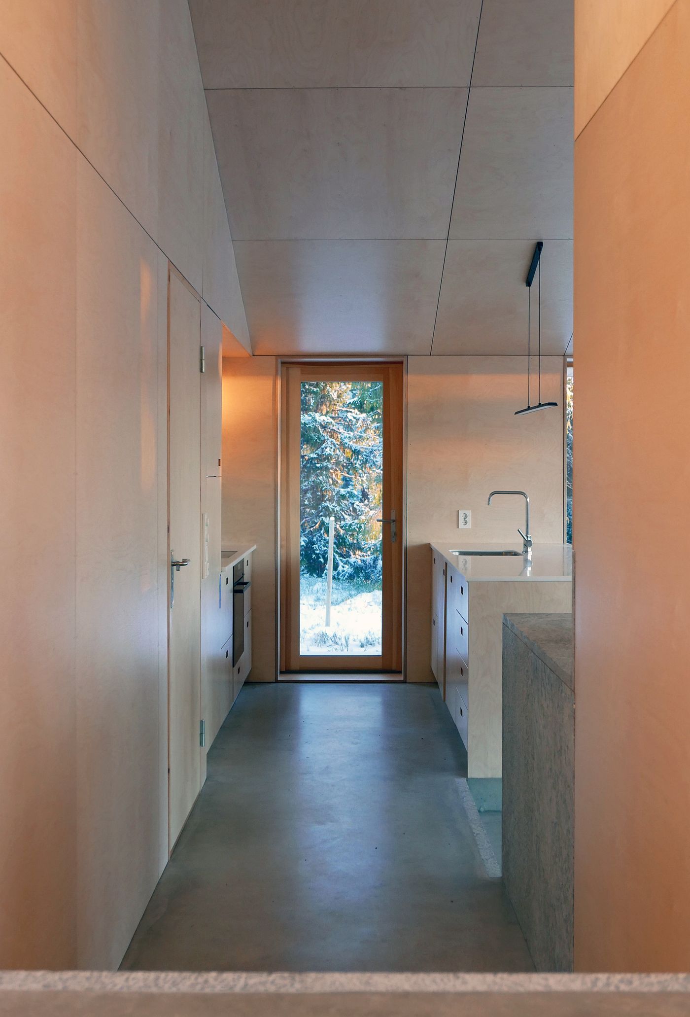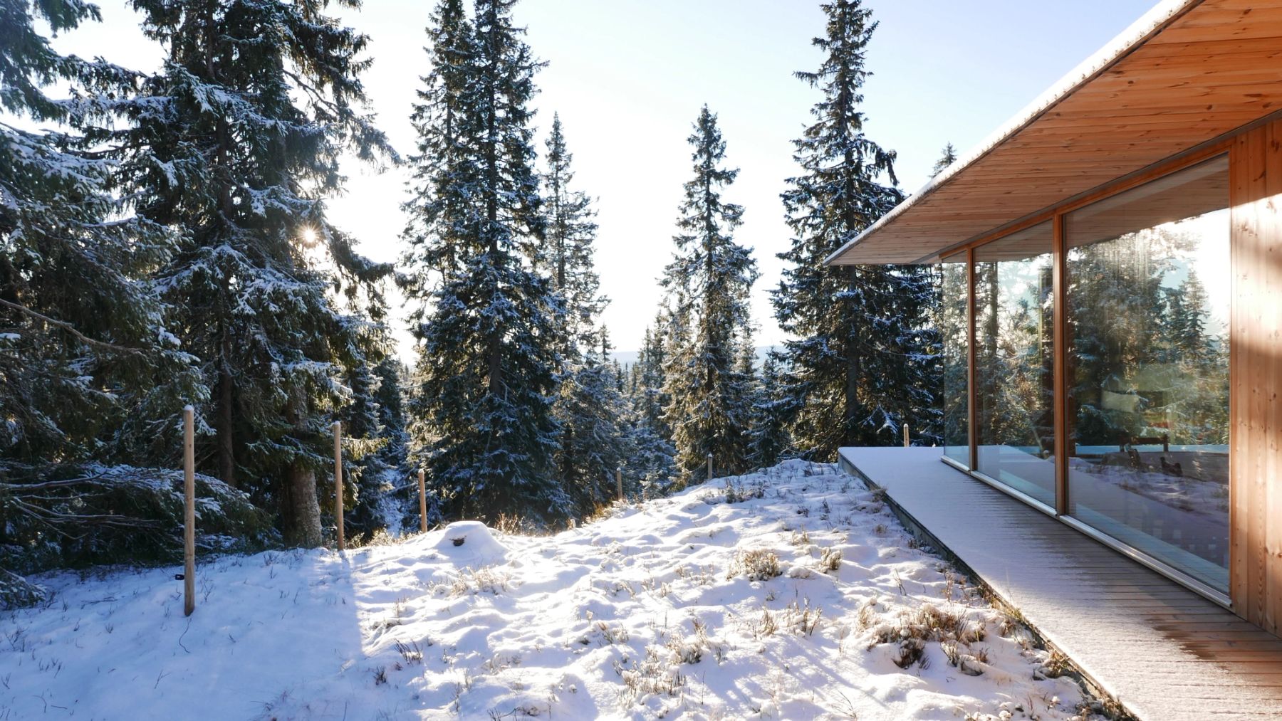 Tilbygget er lagt slik at gulvnivået følger det naturlige fallende terrenget på eiendommen. Dette både for å ivareta mest mulig av den eksisterende terrengformen, samt ikke å overskride mønehøyden på den eksisterende hytta. Takformen følger tverrfallet i terrenget slik at silhuetten fra avstand gjør lite av seg. Hytta er utført som en bindingsverkskonstruksjon. Den er utvendig kledd med kjerneved av furu i ulike formater, og innvendig med kryssfiner av bjerk. Gulv er utført i betong eller heltre bjerk.