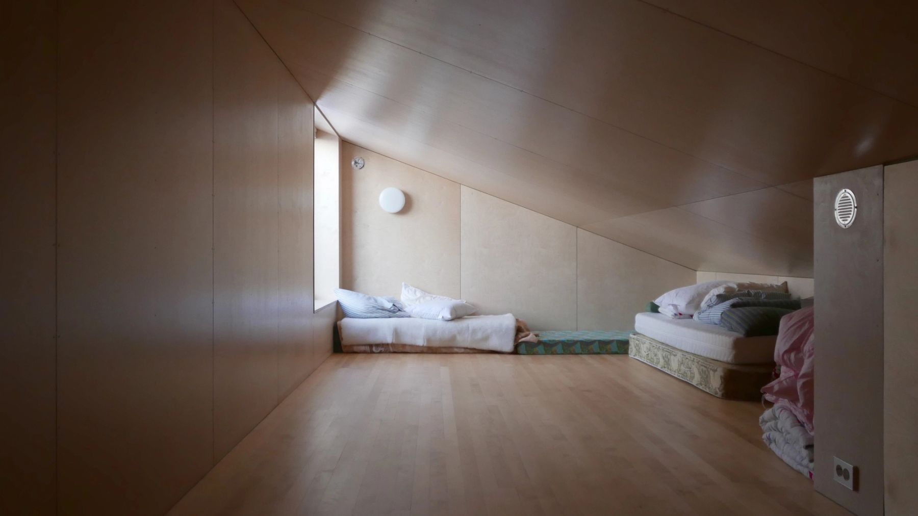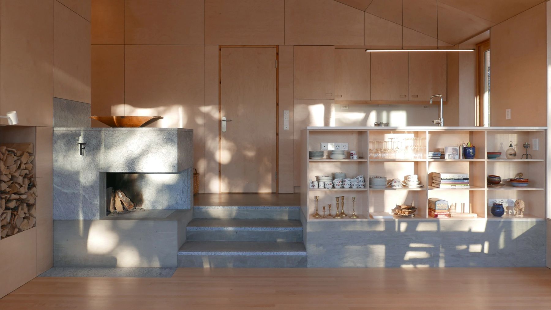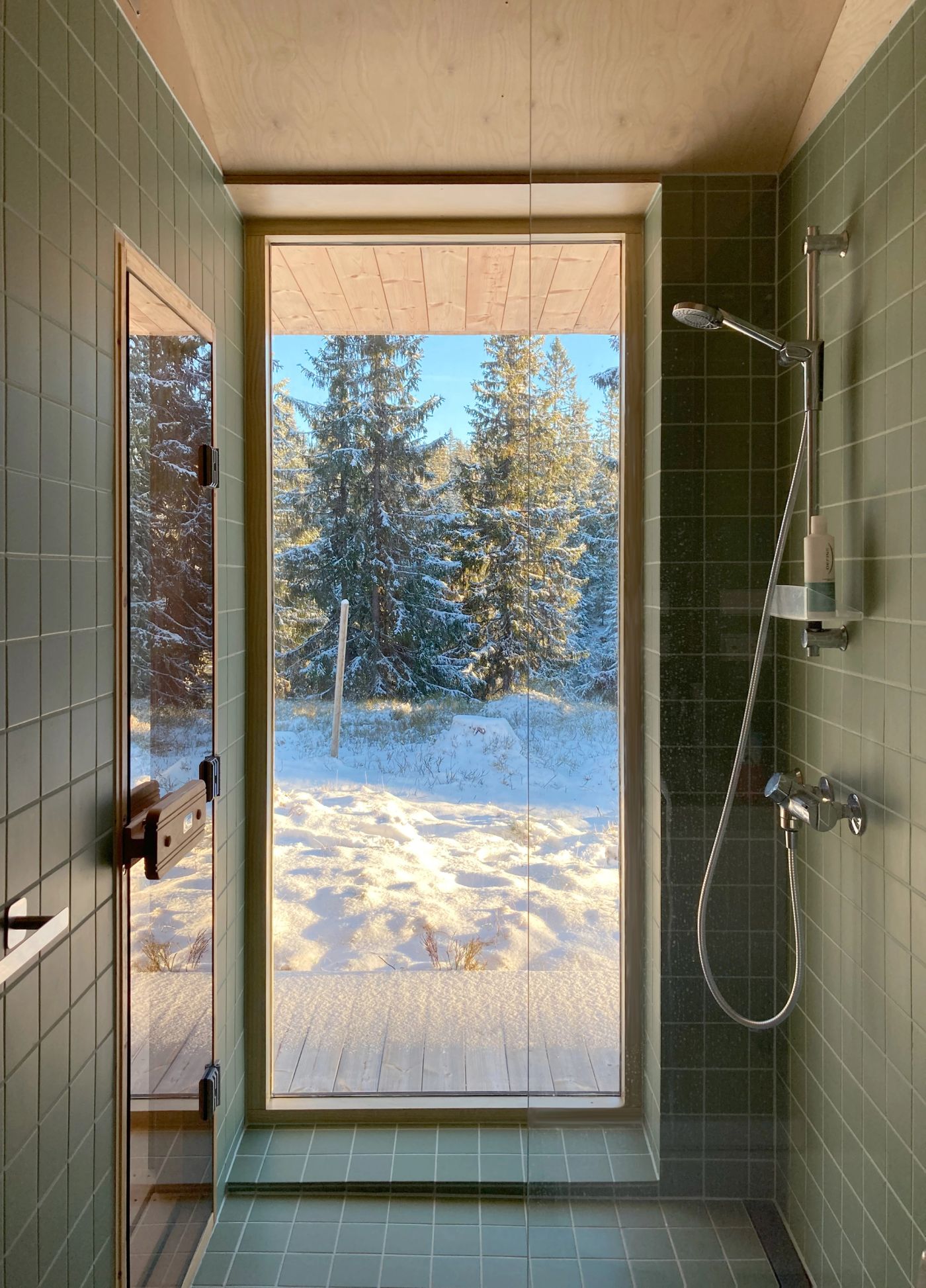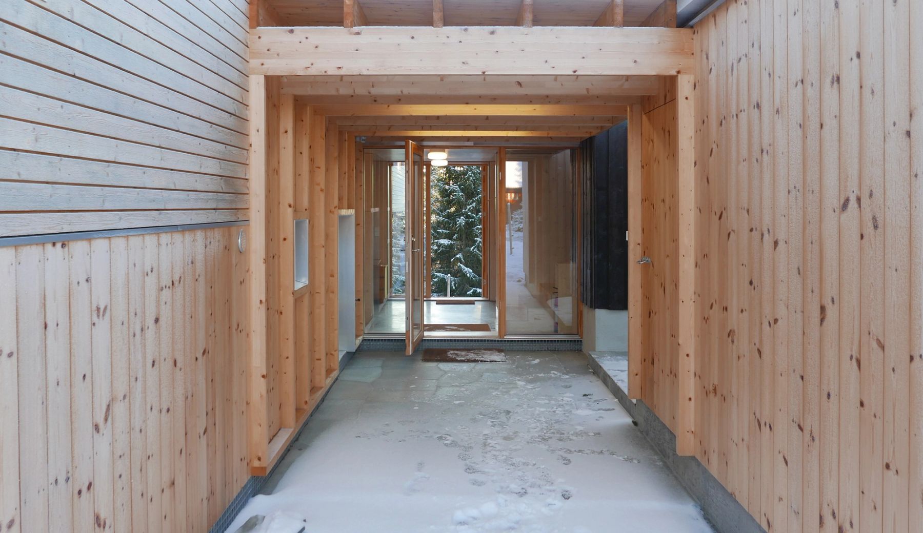 Tilbygget er lagt slik at gulvnivået følger det naturlige fallende terrenget på eiendommen. Dette både for å ivareta mest mulig av den eksisterende terrengformen, samt ikke å overskride mønehøyden på den eksisterende hytta. Takformen følger tverrfallet i terrenget slik at silhuetten fra avstand gjør lite av seg. Hytta er utført som en bindingsverkskonstruksjon. Den er utvendig kledd med kjerneved av furu i ulike formater, og innvendig med kryssfiner av bjerk. Gulv er utført i betong eller heltre bjerk.