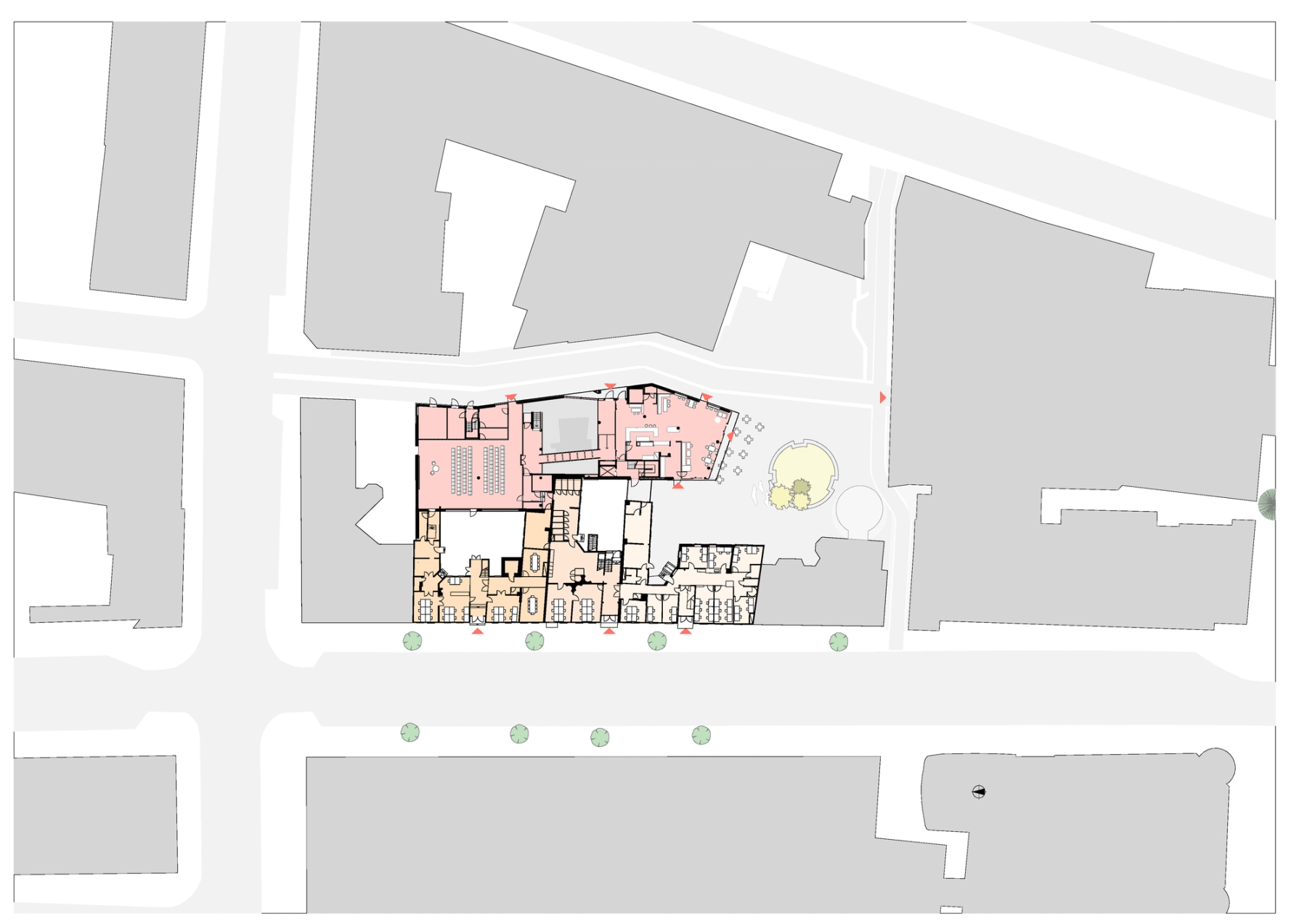 Nybygget ved Peter Egges plass ligger i en kompleks, urban situasjon og er sammenbygd med eksisterende trehusbebyggelse i kvartalet. Bygget reetablerer det historiske gateforløpet til Krambugata, en av Trondheims eldste gater og en av få som stammer fra middelalderbyen. Prosjektet omfatter også en opprusting og vitalisering av Peter Egges plass i Krambugatas sørlige ende.