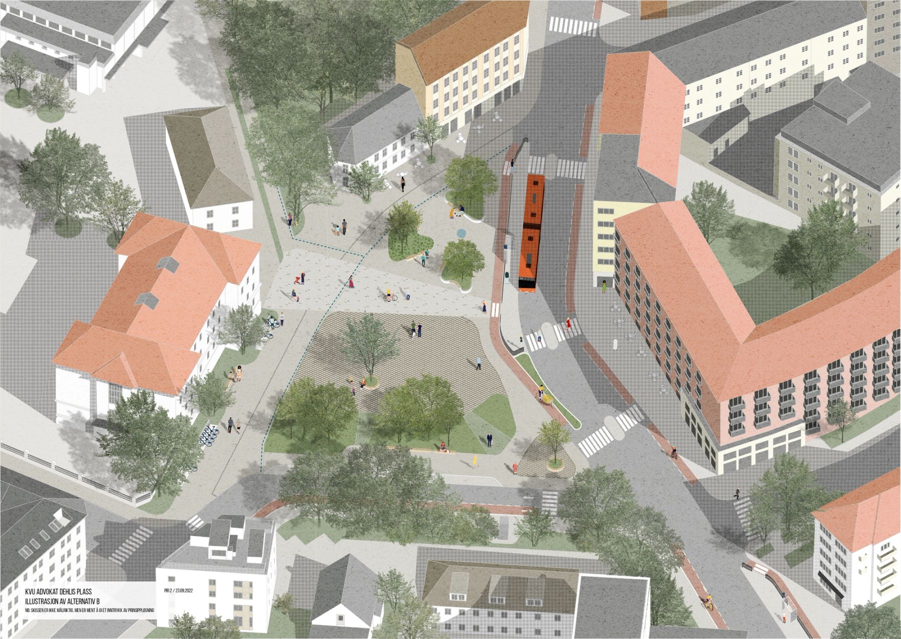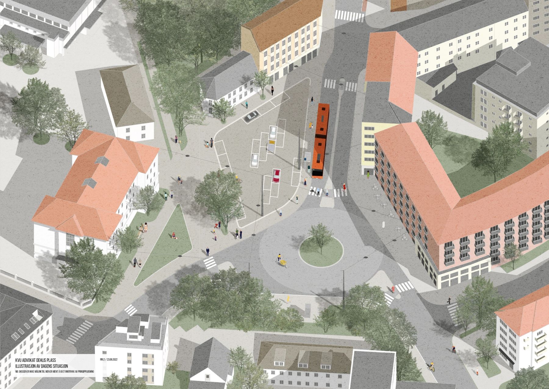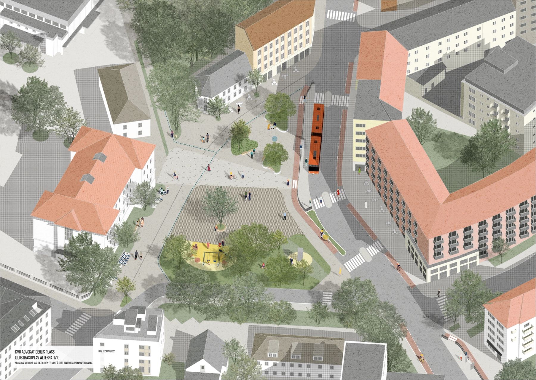 På oppdrag fra Bymiljøetaten i Oslo kommune har PIR2 og EFLA utført en konseptvalgutredning (KVU) for å vurdere ulike alternative grep som gir rom for park og møteplasser. Det er vurdert tre ulike alternativ i tillegg til 0-alternativet (dagens situasjon) som i varierende grad legger til rette for ny bruk. Rapporten fra arbeidet (Oslo kommunes mal for KVU) dokumenterer på en grundig måte hvordan sted, bruk og trafikk sees i sammenheng med overordnede føringer, premisser, behov, innspill og målsettinger. KVUen gir på en oversiktlig måte et helhetlig bilde av alle forhold som har betydning for valg av konsept for en fremtidig utvikling av Advokat Dehlis plass. Alle tiltak gir ulike konsekvenser, vårt arbeid i dette oppdraget var å utarbeide optimale løsninger for tre ulike konsept, og synliggjøre konsekvensene ved disse for å gi beslutningstakere argumenter og grunnlag for å ta sitt valg.