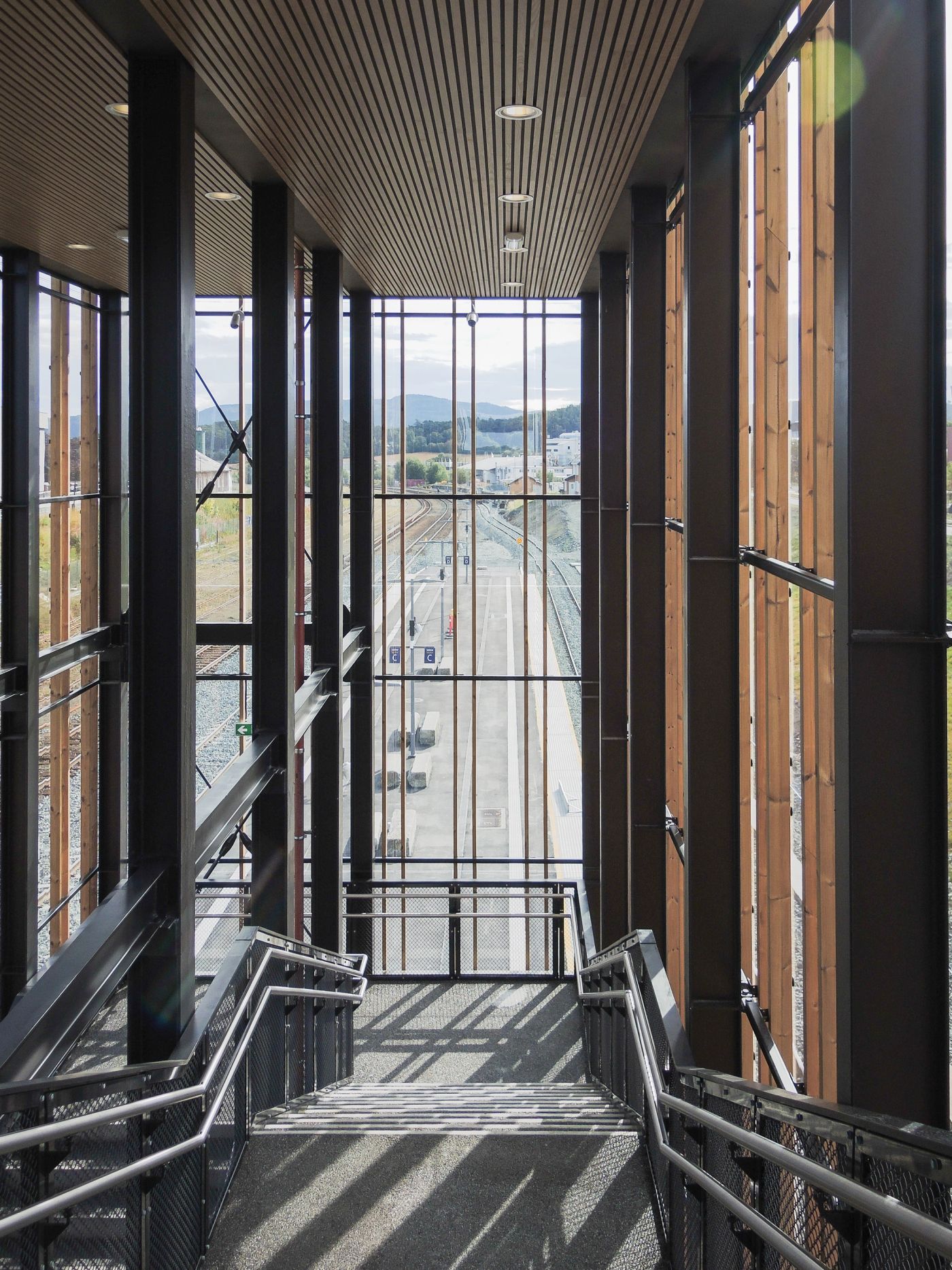 Oppdraget omfatter komplett universell utforming av brutilkobling, trapp og heishus, visuelt miljø på plattform inkludert skilting, møblering, belysning samt taktil merking ledesystem og sikkerhetssoner. Arealet under veibrua er oppgradert som overdekning for reisende med jernbanen.