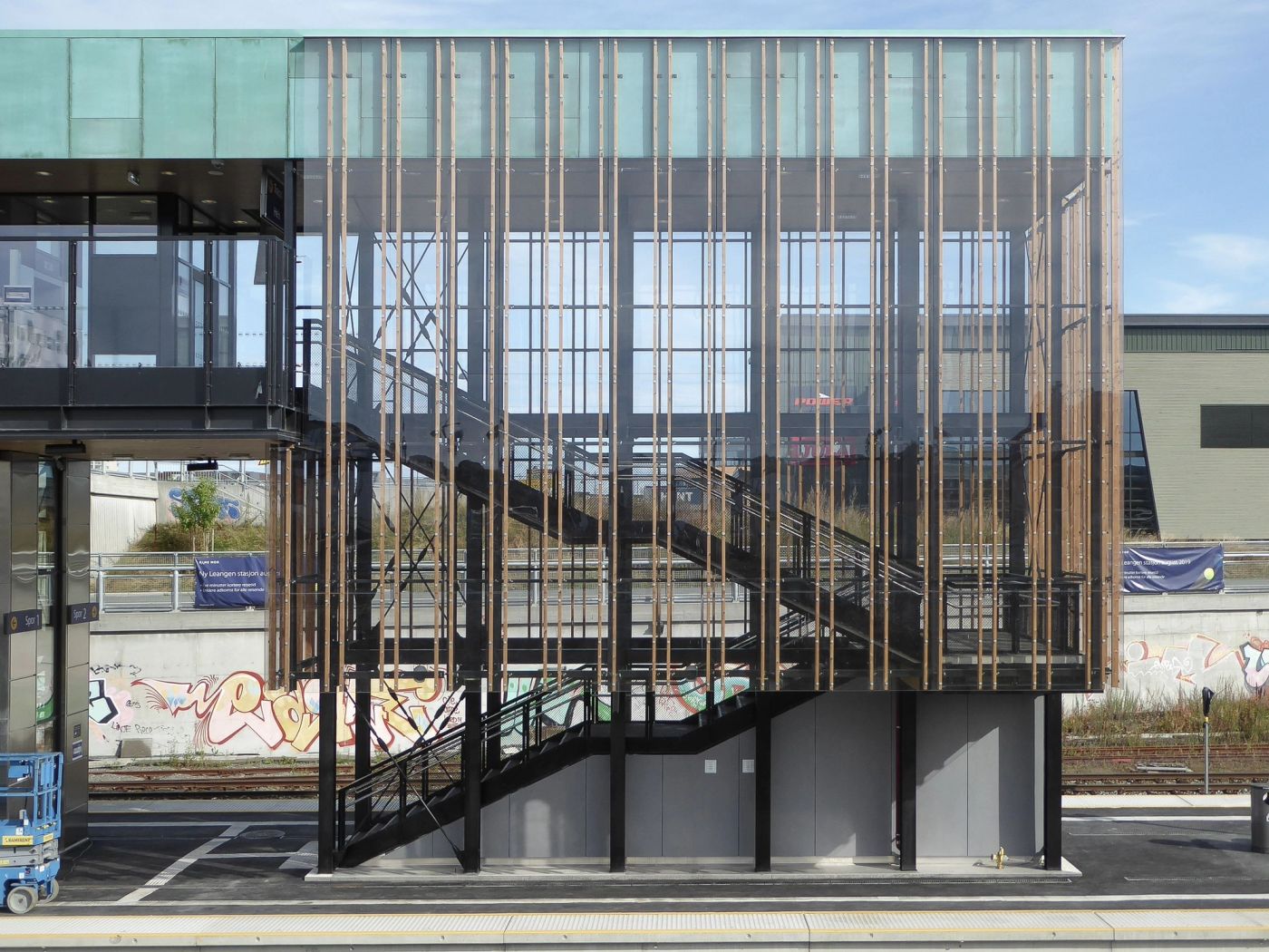 Hovedelementene i trapp-og heishuset er betong, glass, stål og tre. Elementene kobles sammen med rene linjer og enkle detaljer. Innslaget av tremateriale i møblering, himlinger og fasader, gir stasjonen et «varmere» uttrykk, i et område som ellers er preget av harde flater som betong og asfalt.