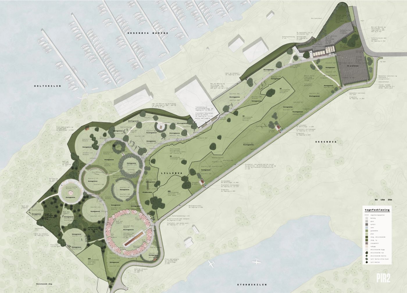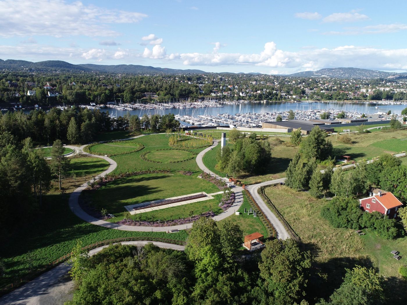 Lilleøya er et velbrukt friluftsområde og den nye gravplassen grenser til naturvernområder, naturreservater, en eksisterende marina og sjøflyhavn. Gravlunden er bygget langs den vernede slåttemarken og innad på tomten ivaretas den fredede dragehodeglansbillen på åpen grunnlendt kalkmark og en huleik. Det er lagt opp til ca 15.000 graver, driftsgård med kontor, klokketårn og kontemplasjonsrom, og det er skapt myke overganger mellom kulturlandskapet og selve minnelunden.