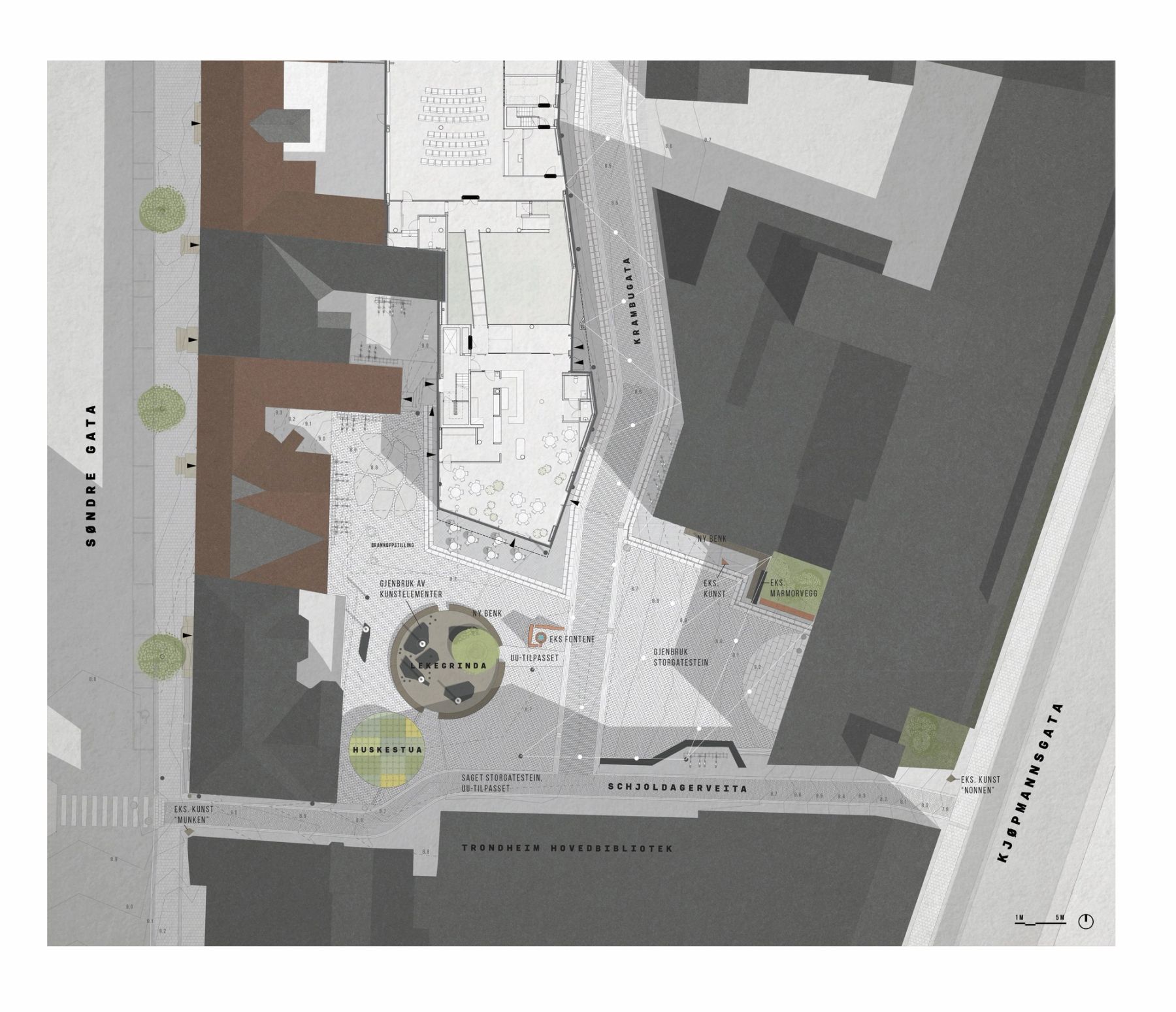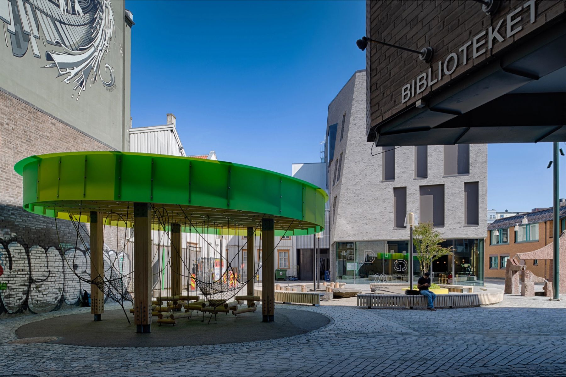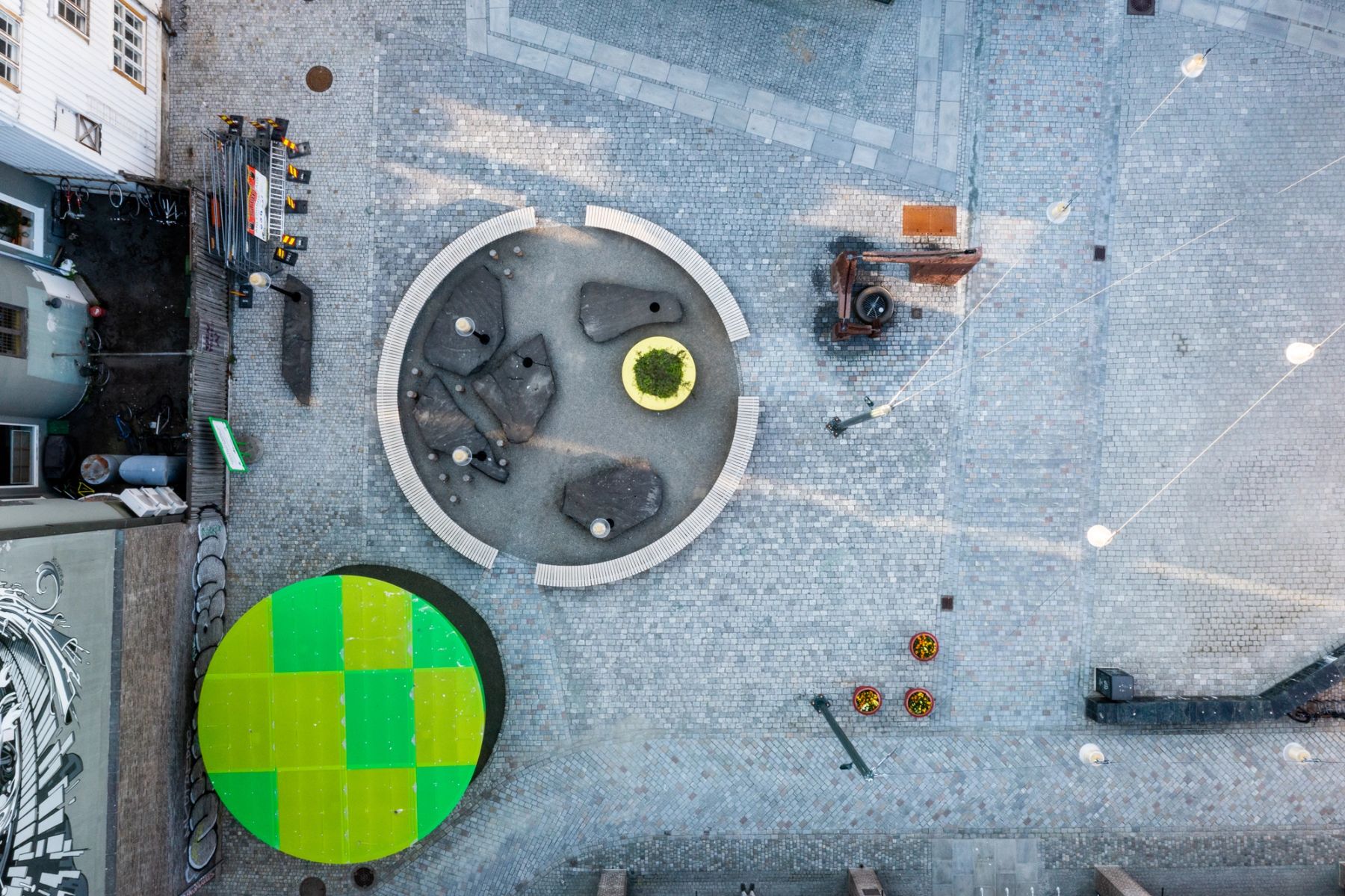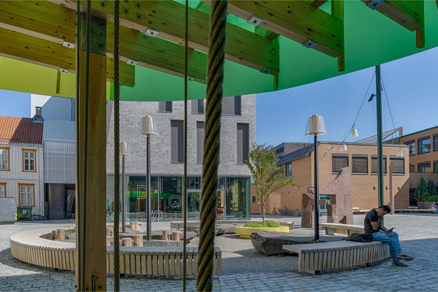Utfordringen i prosjektet har i stor grad vært å tilrettelegge for lek, samtidig som plassen skal ivareta de historiske og antikvariske interessene, varelevering til flere store næringstomter, adkomst for brannbil og universell tilrettelegging. Løsningen har blitt to hovedelementer: Lekegrinda og Huskestua. Lekegrinda består av en stor sirkelrund benk som danner et lekent rom bestående av bla. annet gjenbruk at Bård Breivik sine steinskulpturer. Huskestua er et overbygd lekeelement bestående av klatre- og gyngefunksjoner i tau. I tilknytning til nytt næringsbygg på plassen er det etablert en café på plassen.