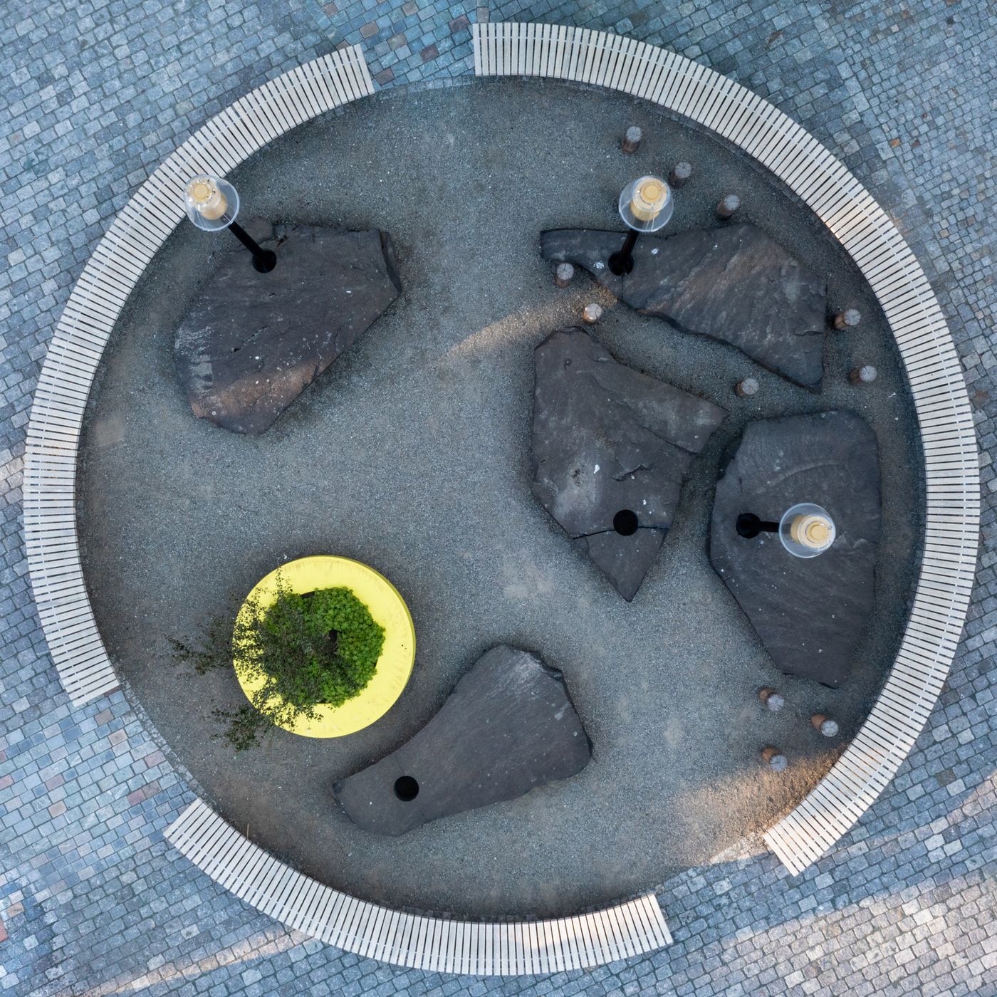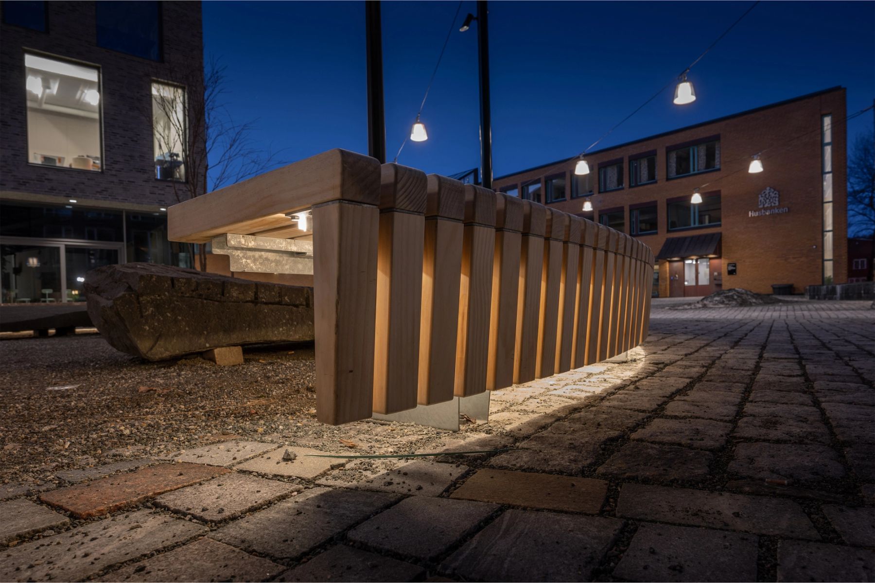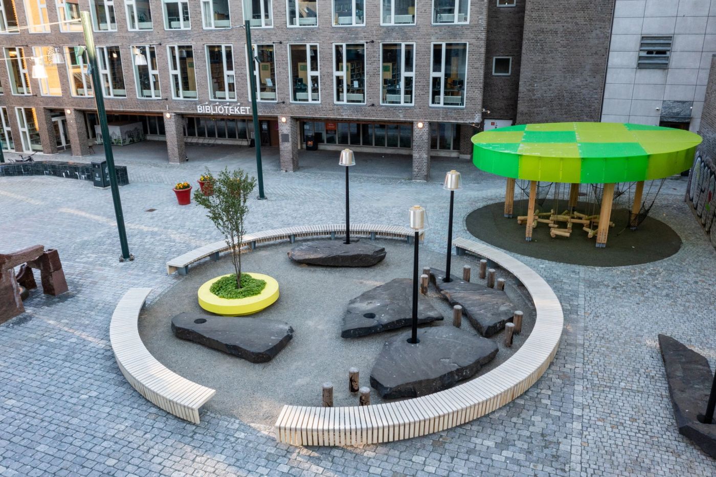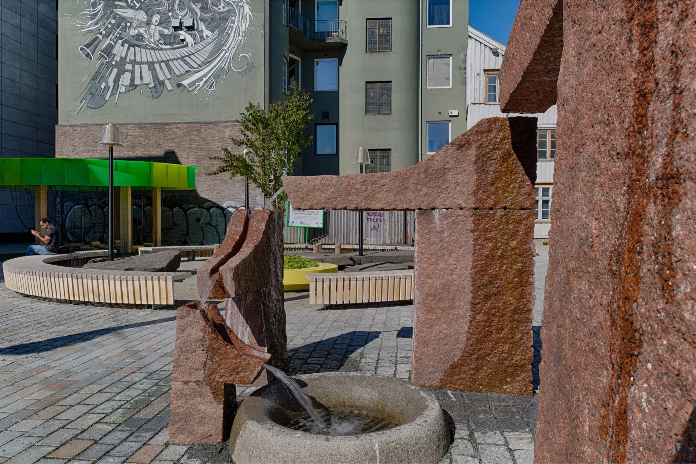 Utfordringen i prosjektet har i stor grad vært å tilrettelegge for lek, samtidig som plassen skal ivareta de historiske og antikvariske interessene, varelevering til flere store næringstomter, adkomst for brannbil og universell tilrettelegging. Løsningen har blitt to hovedelementer: Lekegrinda og Huskestua. Lekegrinda består av en stor sirkelrund benk som danner et lekent rom bestående av bla. annet gjenbruk at Bård Breivik sine steinskulpturer. Huskestua er et overbygd lekeelement bestående av klatre- og gyngefunksjoner i tau. I tilknytning til nytt næringsbygg på plassen er det etablert en café på plassen.