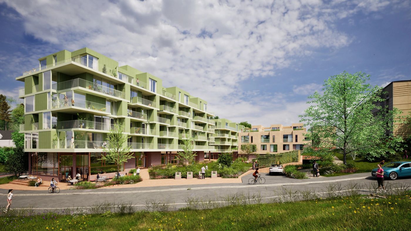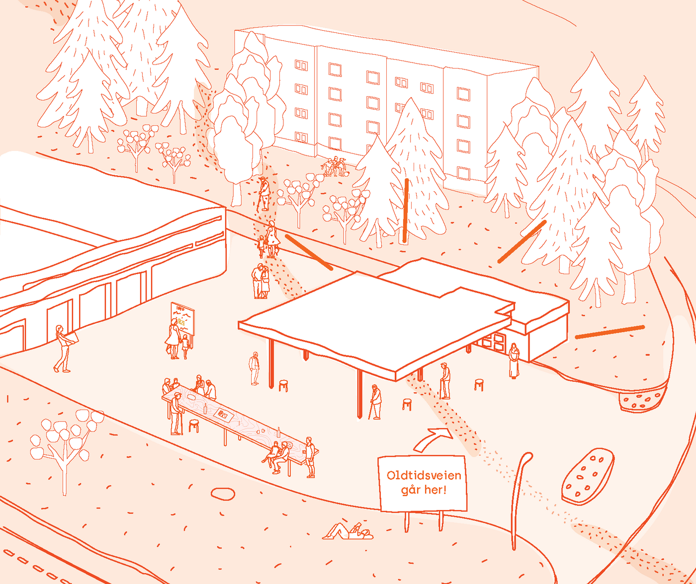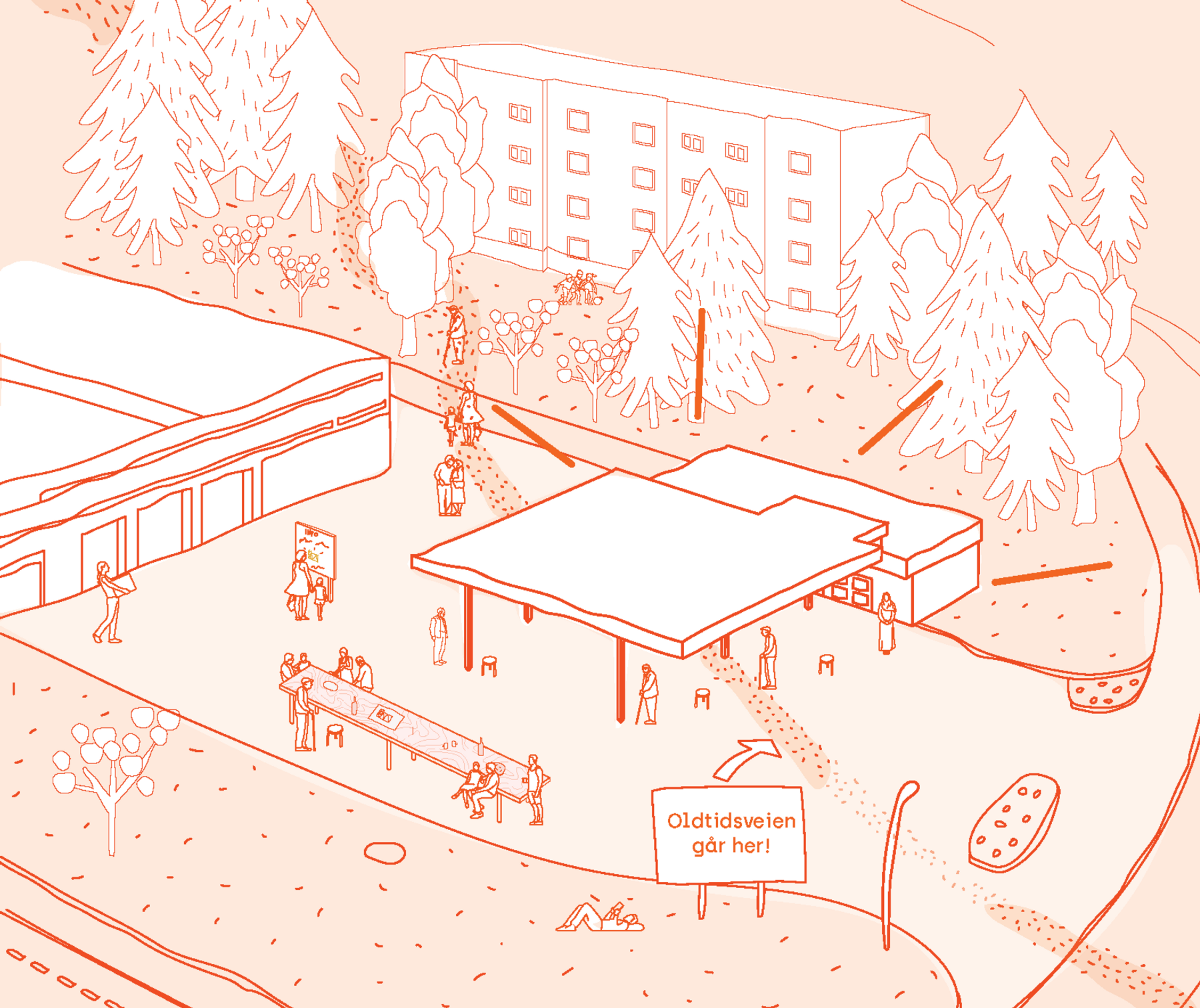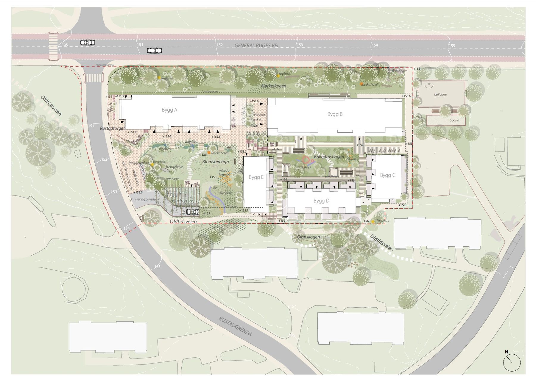 Bygningsmassen tilpasser seg terrenget og fungerer som støyskjerm mot veien. Landskapet integreres i fellesområdene, øker biologisk mangfold, og skaper naturlige leke- og læringssteder. Vi ser også på å bruke de eksisterende bygningene og tomten som den er i dag for å forankre prosjektet til nabolaget. Dette er en del av vår pågående samarbeidsprosess med lokalsamfunnet, der målet er å gi befolkningen eierskap til prosjektet og muligheten til å bidra med ideer og innspill både for midlertidige tiltak i planleggingsfasen og selve boligprosjektet.