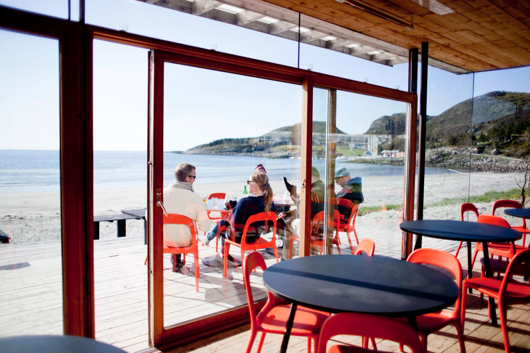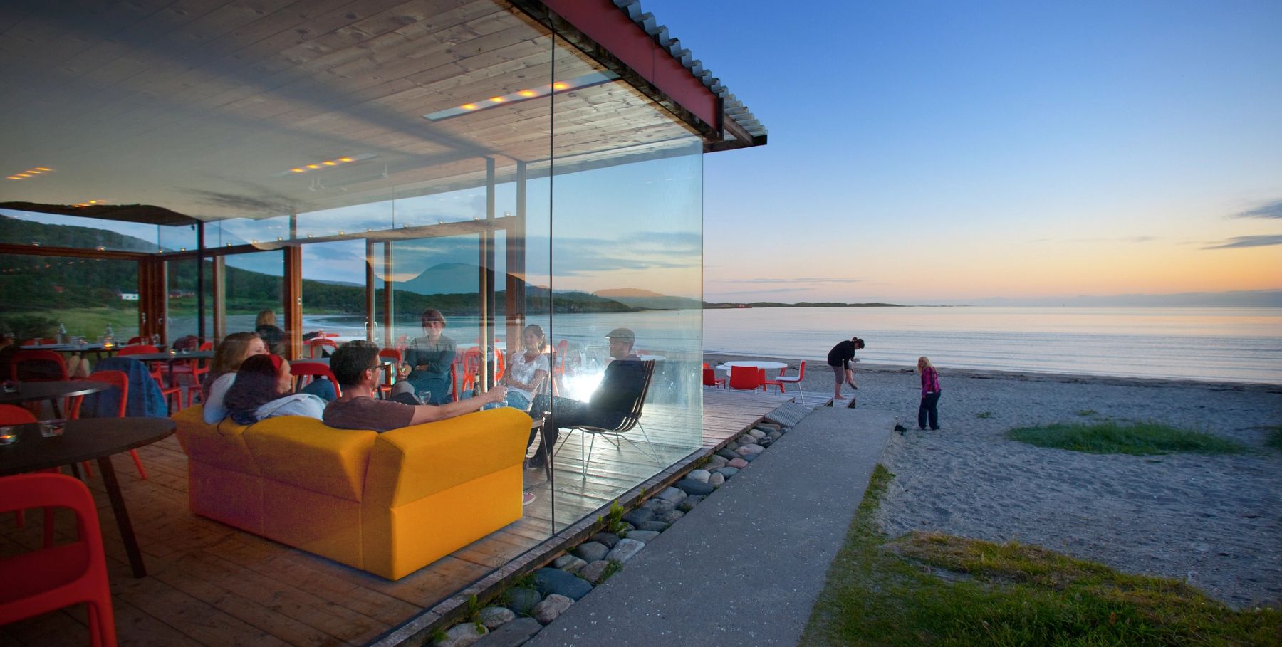 Helt nede på banken, delvis skjult av fredet tinnvedkratt; med brede trinn ned mot den hvite sanda på Hosnasand, store glassflater for å kunne nyte de vakre solnedgangene eller se stormen komme inn fra storhavet. Siden åpningen i påsken 2006, har strandbaren som konsept vært en overveldende suksess, både når det gjelder mat, drikke, natur, kultur og arkitektur.