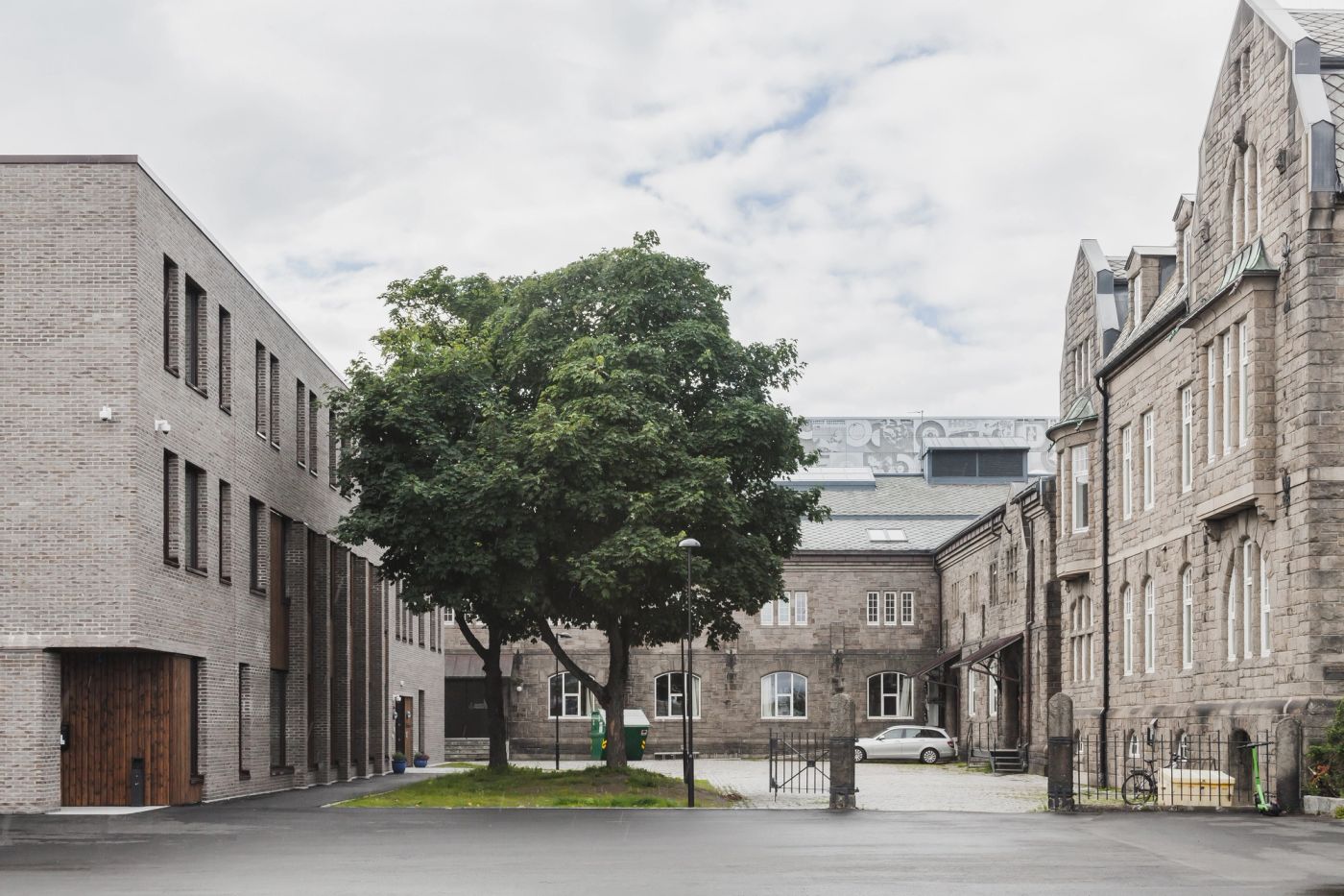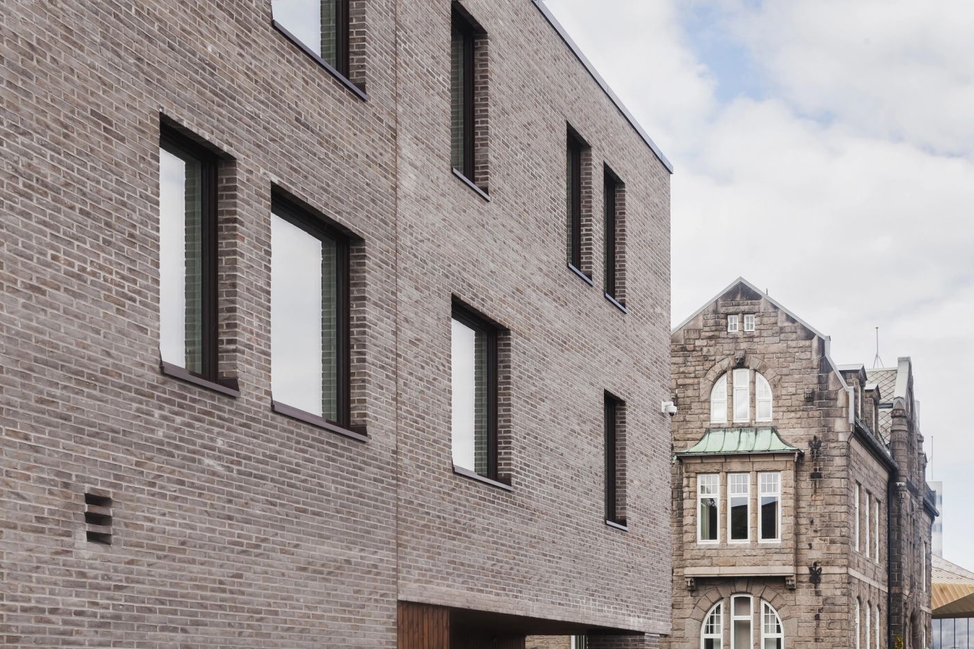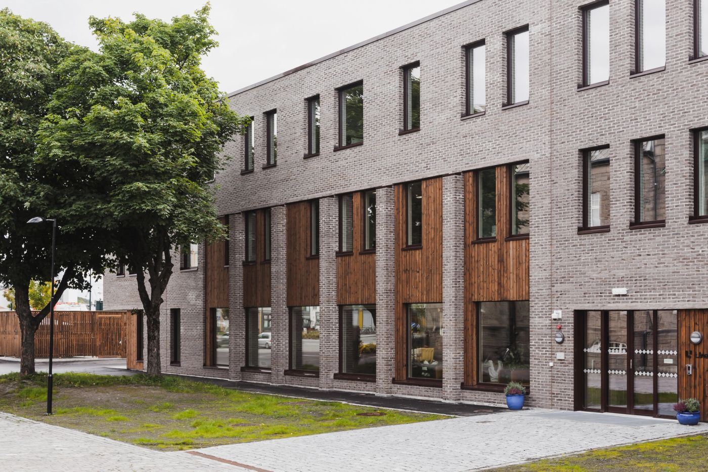 Teglen er trukket helt ned til bakken og dratt inn i vindus- og dørsmyg. Presis bruk av beslag og fargesetting av disse harmonerer både med teglsteinen i nybygget og med kobberbeslagene på Tollboden. I plassrommet er to av Brattøras eldste trær bevart. Mot dette plassrommet har fasaden fått markante teglpilastre over to etasjer med fasadefelt i stående trekledning. Dette grepet tydeliggjør byggets innside, hovedinngang og henvendelse mot plassrommet, i kontrast til den mer lukkede utsiden, mot trafikken på Nordre avlastningsvei.