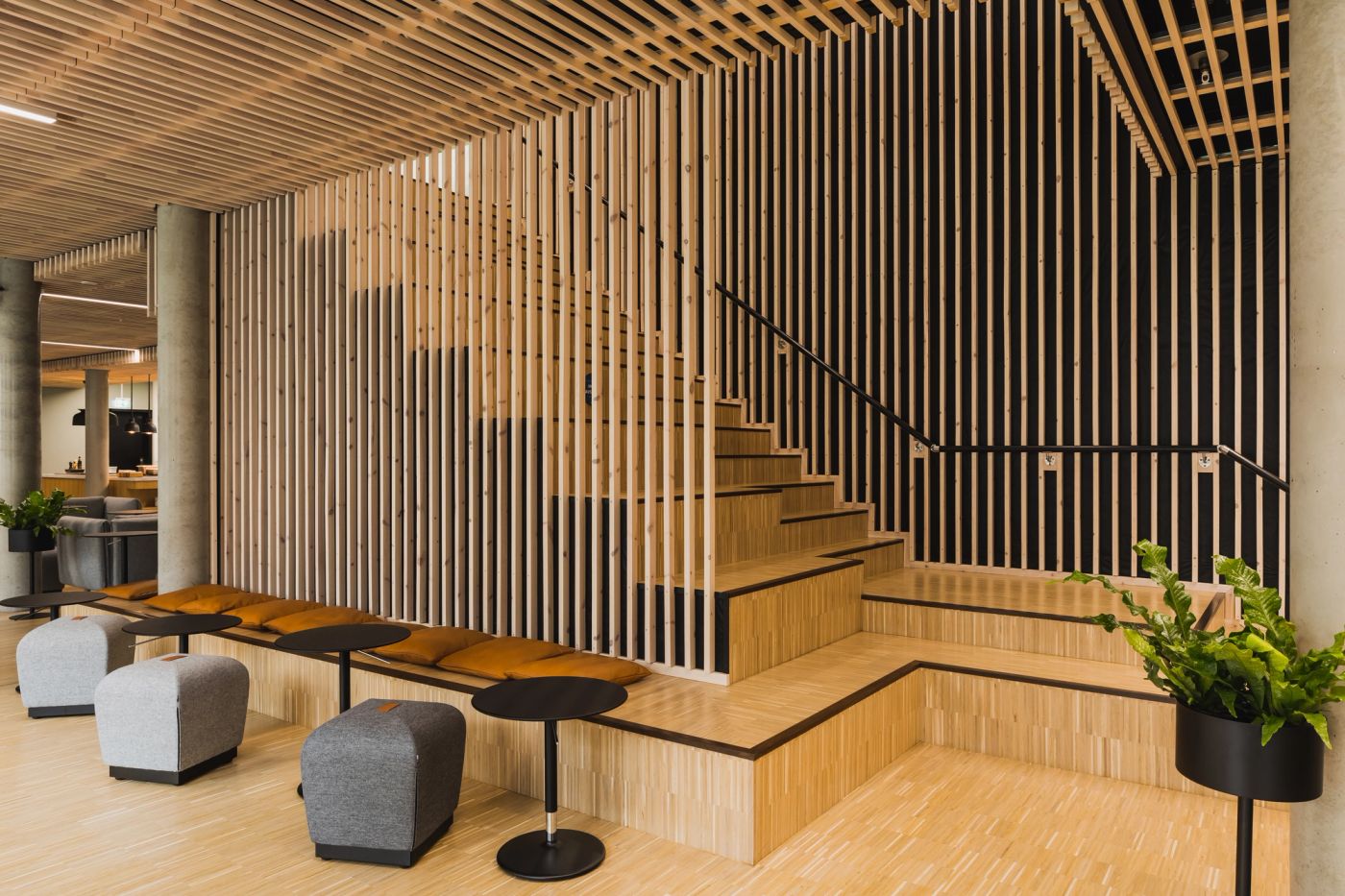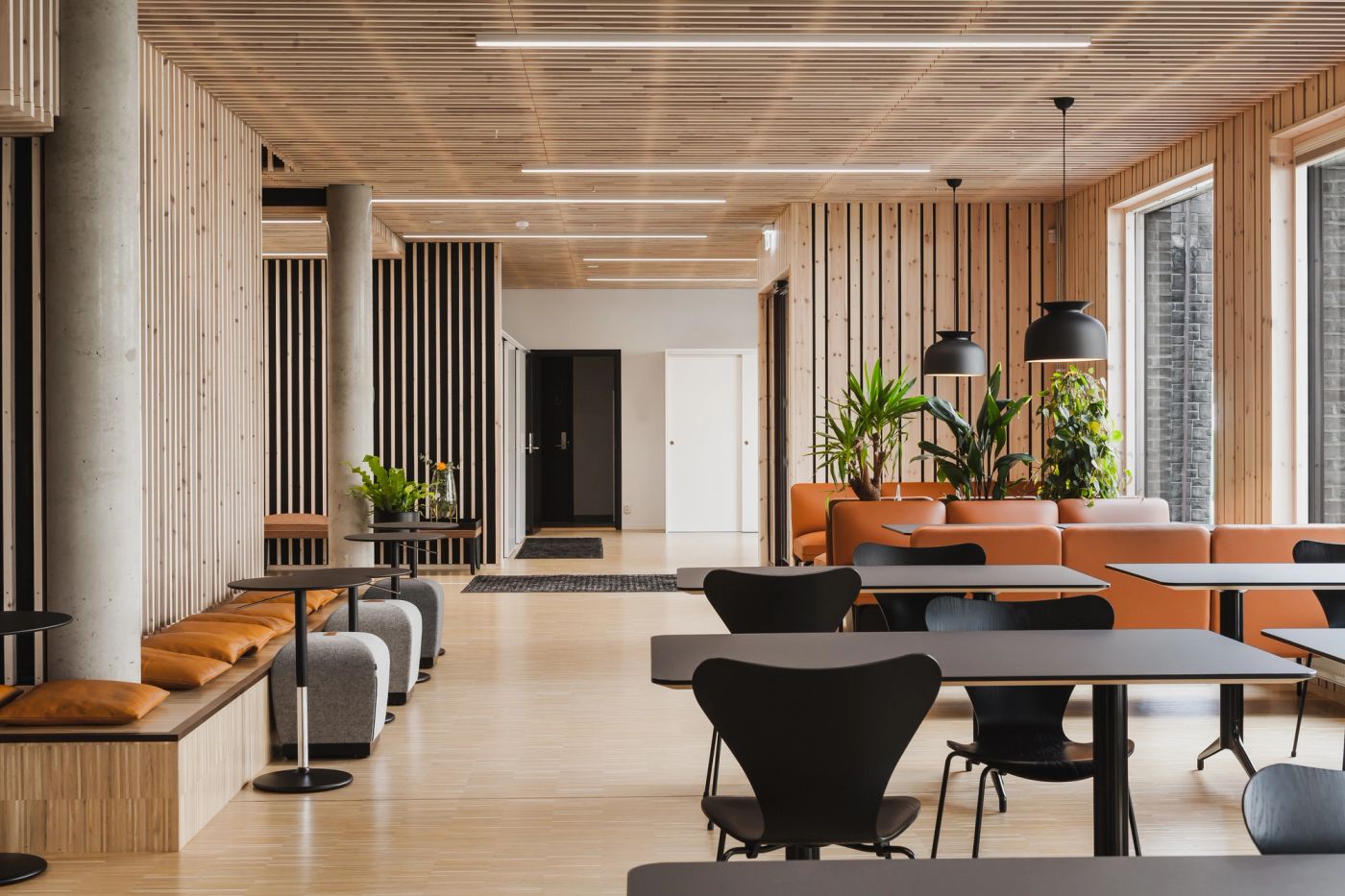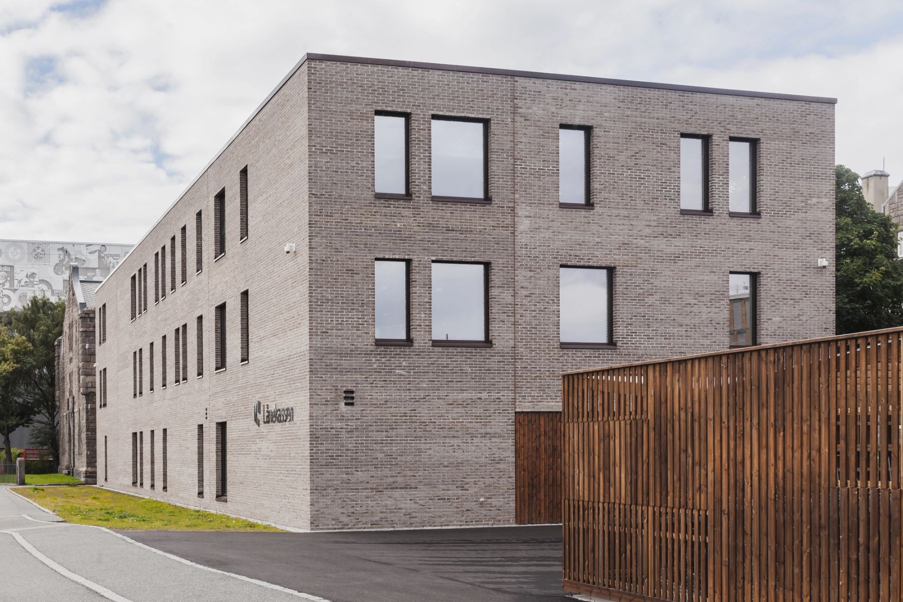 Teglen er trukket helt ned til bakken og dratt inn i vindus- og dørsmyg. Presis bruk av beslag og fargesetting av disse harmonerer både med teglsteinen i nybygget og med kobberbeslagene på Tollboden. I plassrommet er to av Brattøras eldste trær bevart. Mot dette plassrommet har fasaden fått markante teglpilastre over to etasjer med fasadefelt i stående trekledning. Dette grepet tydeliggjør byggets innside, hovedinngang og henvendelse mot plassrommet, i kontrast til den mer lukkede utsiden, mot trafikken på Nordre avlastningsvei.
